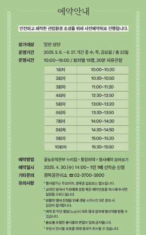 교태전은 평소에 관람이 어려운 공간이에요. 이번에 2025년 5월 8일부터 6월 27일까지 매주 수, 목, 금요일에만 열립니다. 매일 10회차로 나뉘어 진행되고, 각 회차는 20분씩이에요. 하루 관람 인원도 제한되어 있어서 빠르게 예약하시는 게 좋겠죠!
