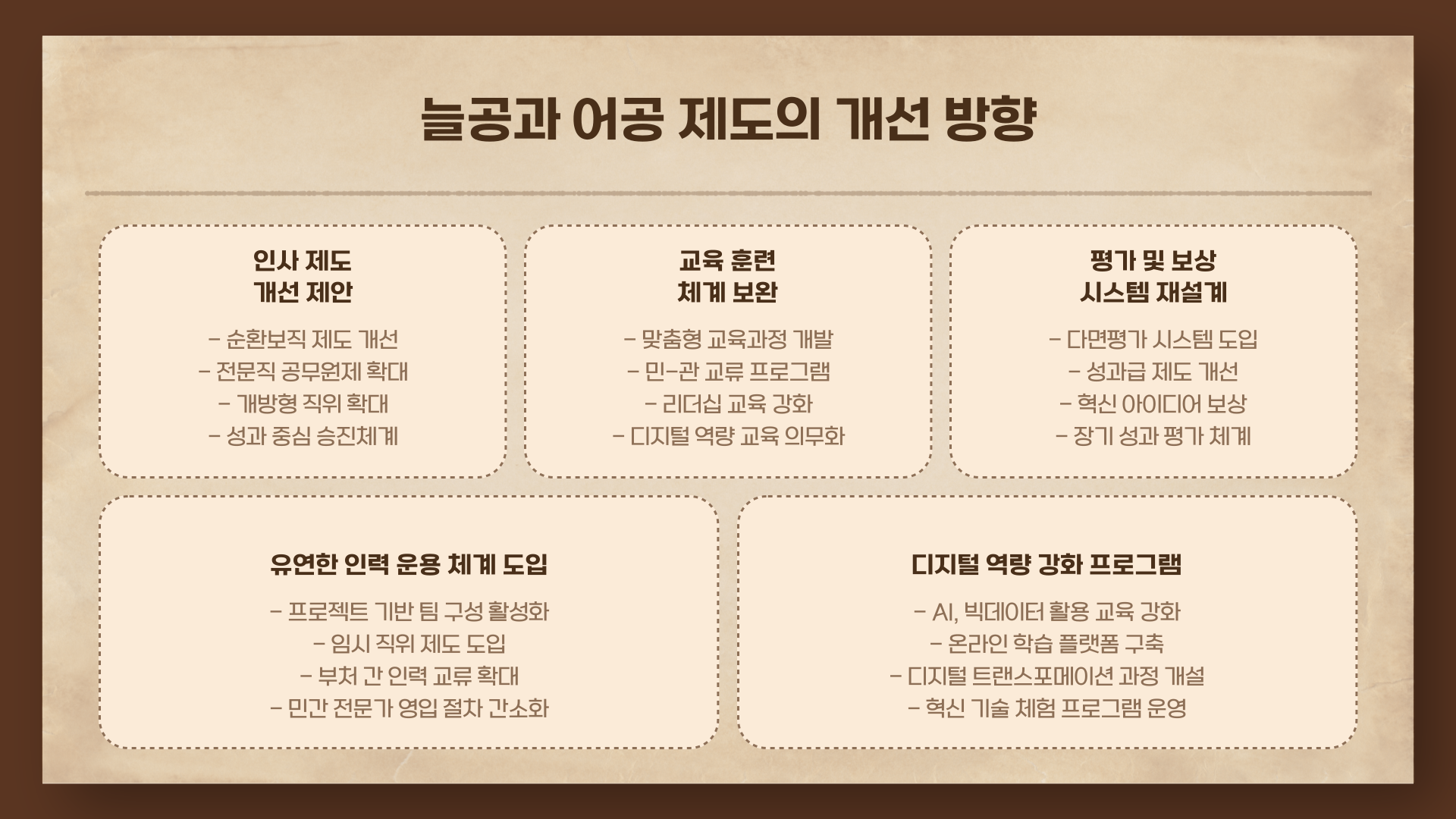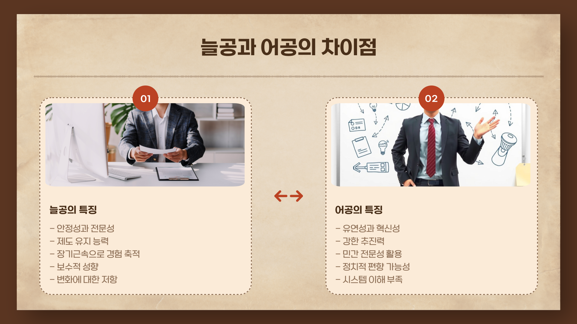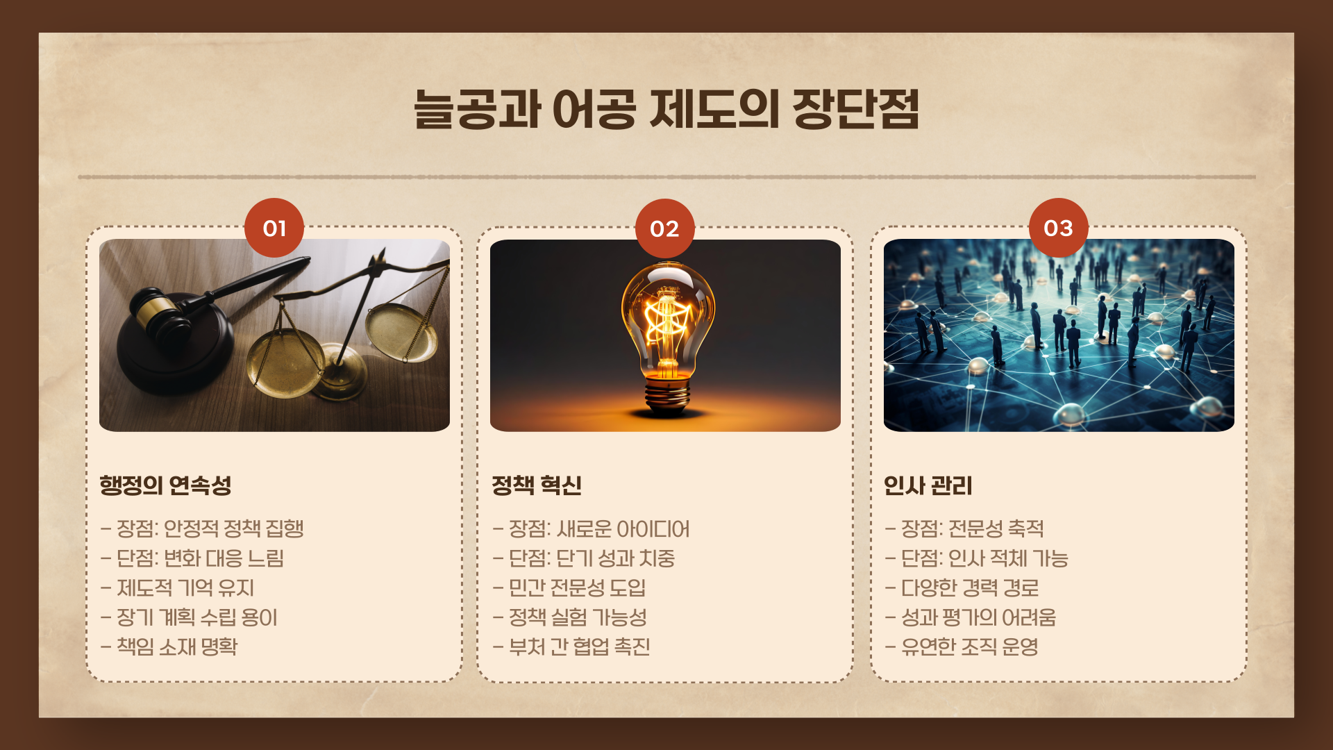 | 단점 | 보수적, 관료주의, 변화 저항 | 시스템 이해 부족, 정치 편향 |