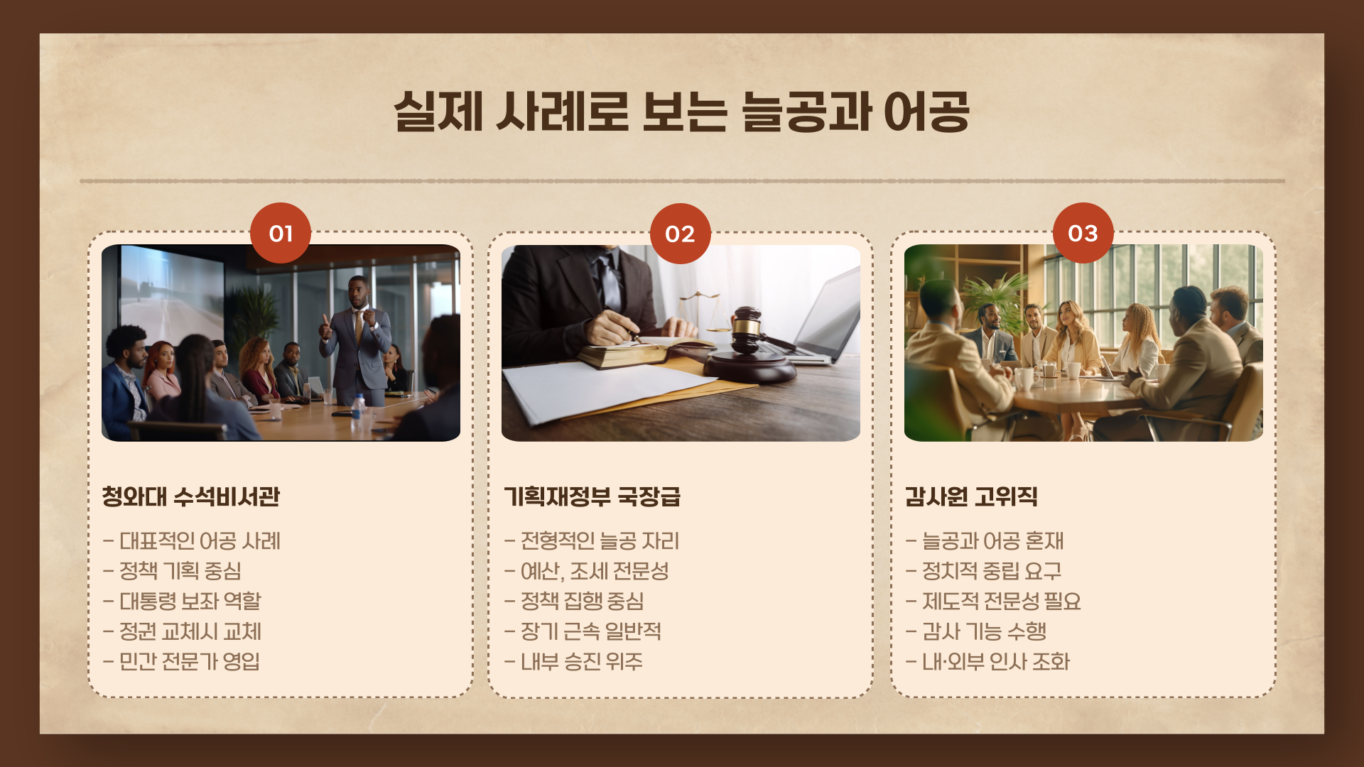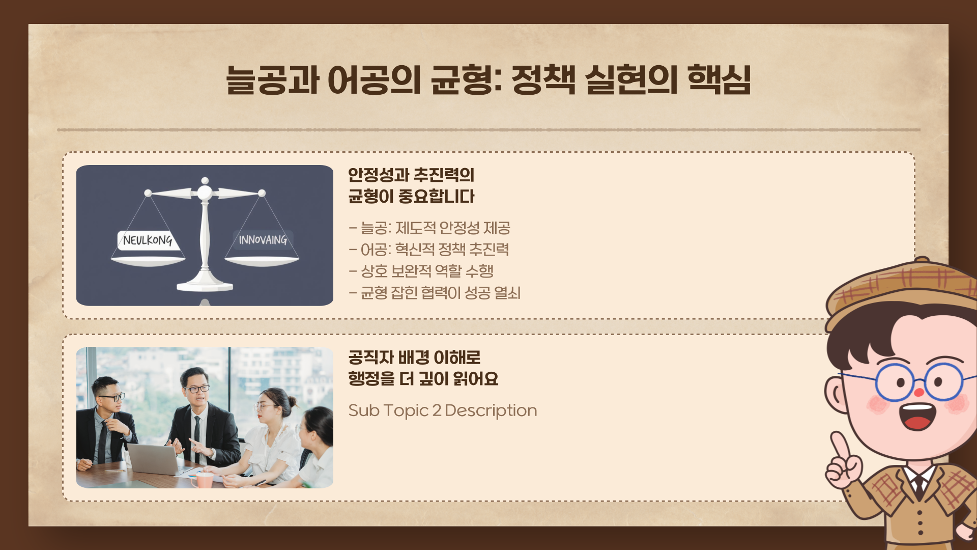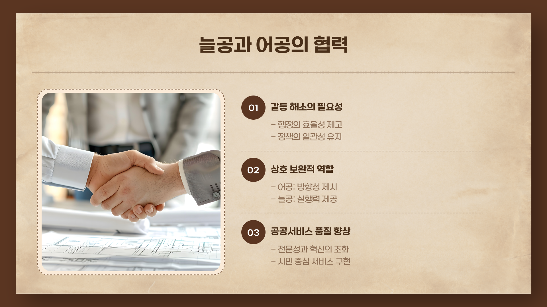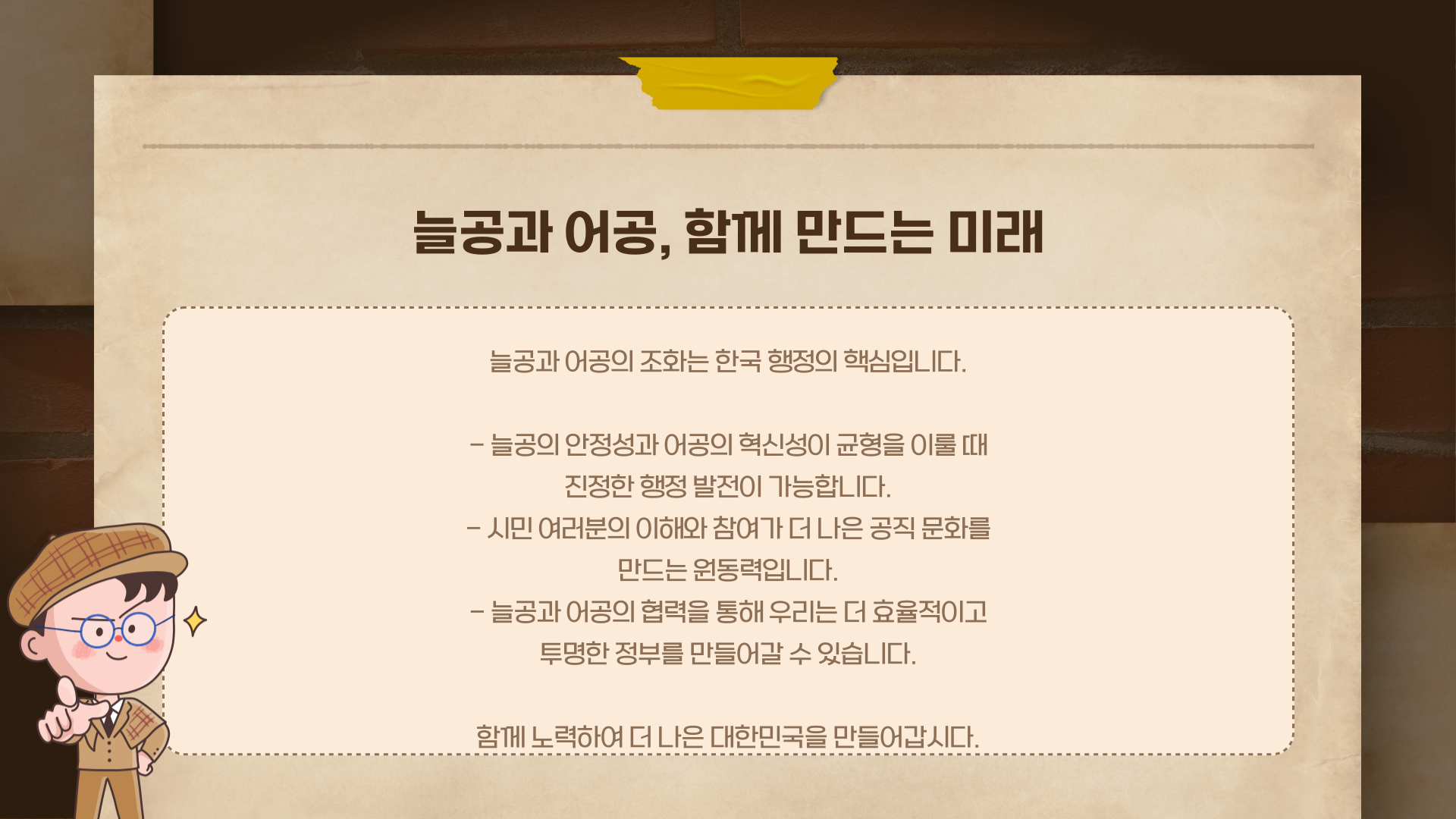 하지만 결국에는 어공이 제시한 방향을 늘공이 현실적으로 풀어내는 구조가 되어야 정책이 제대로 작동하거든요. 서로의 역할을 인정하고 조화롭게 협력할 때, 공공서비스의 품질도 함께 높아지죠.