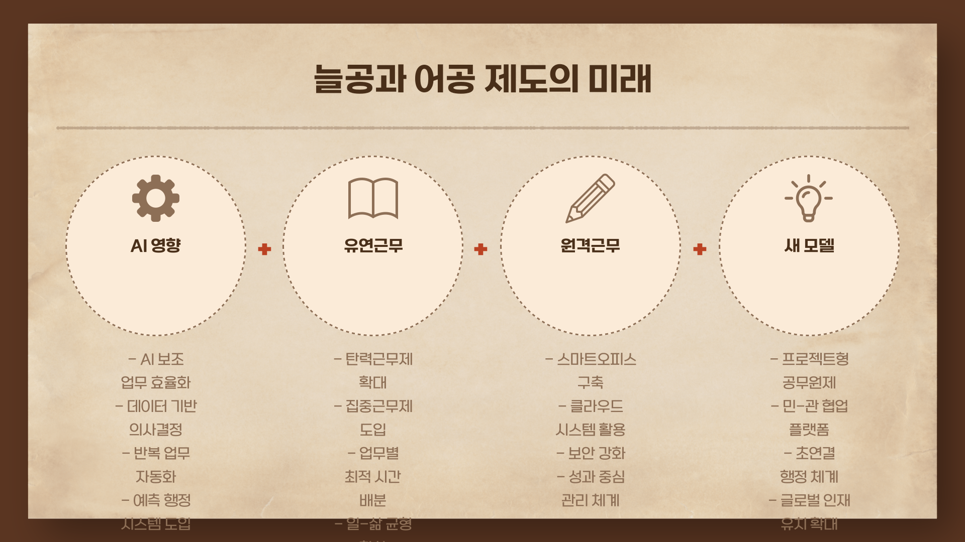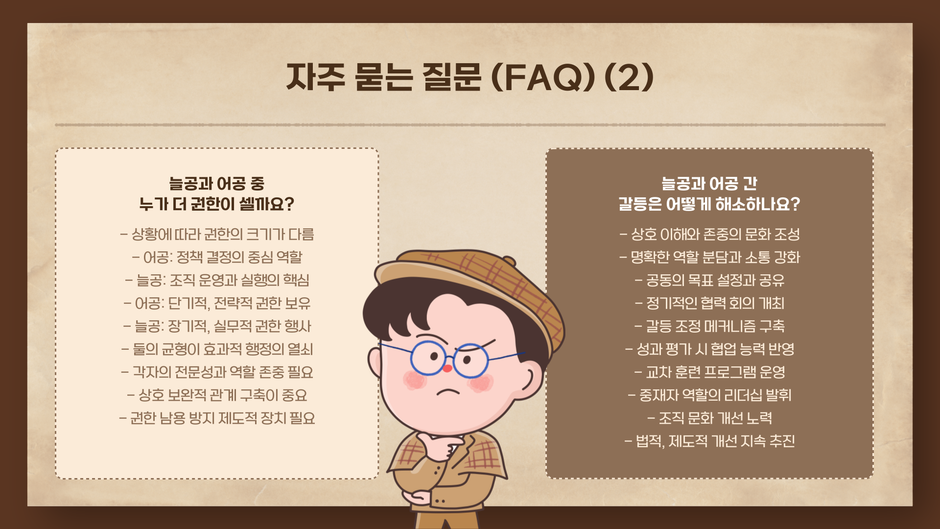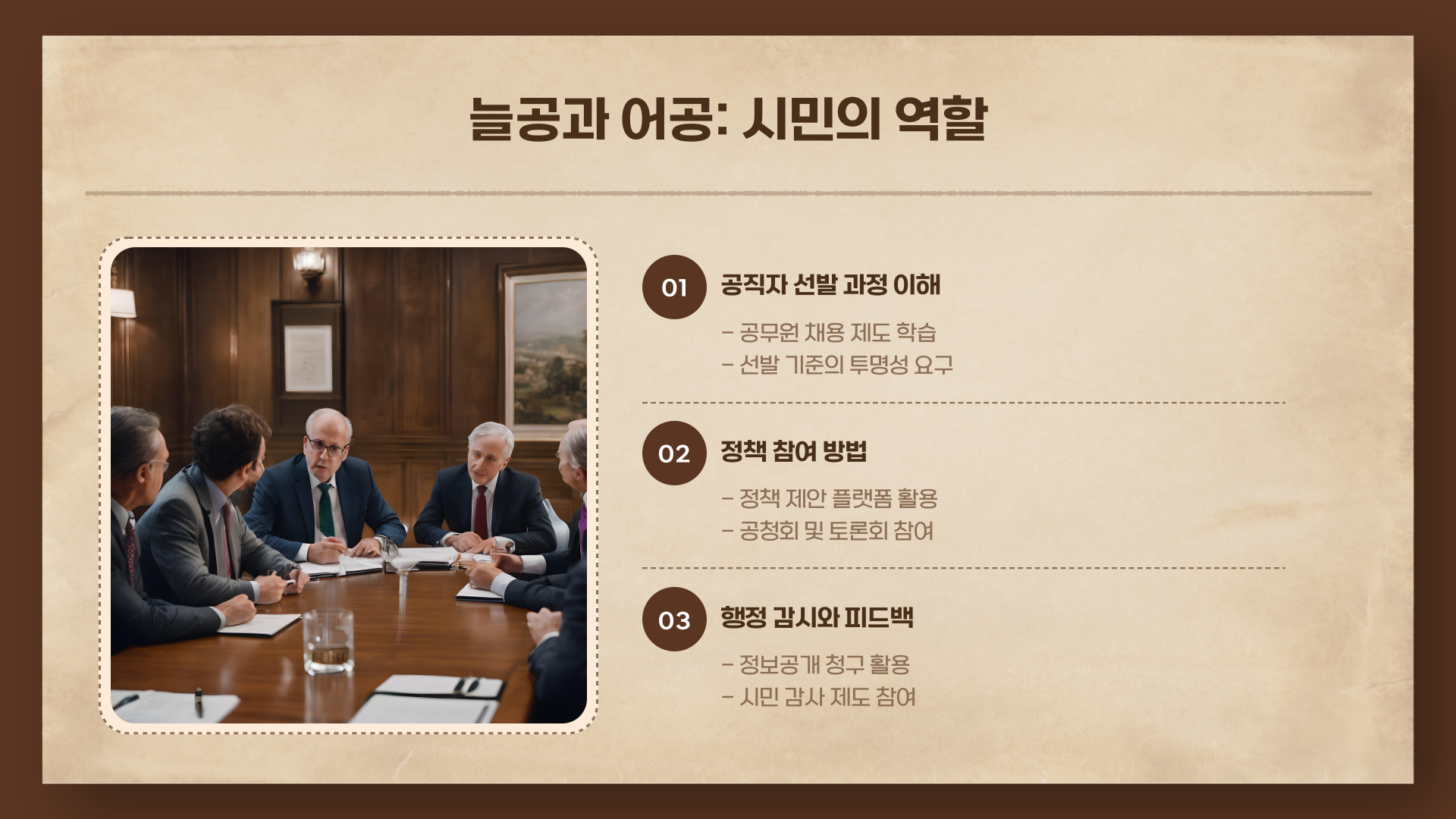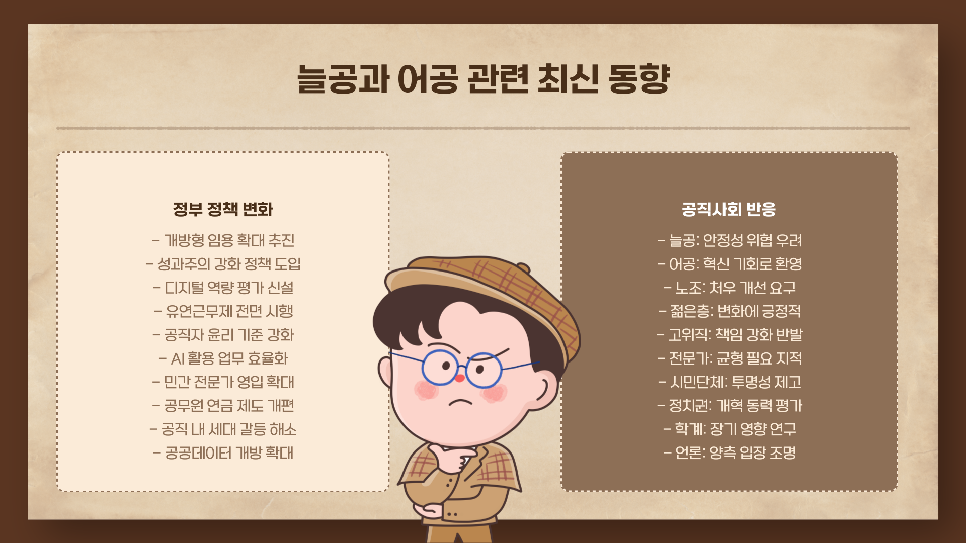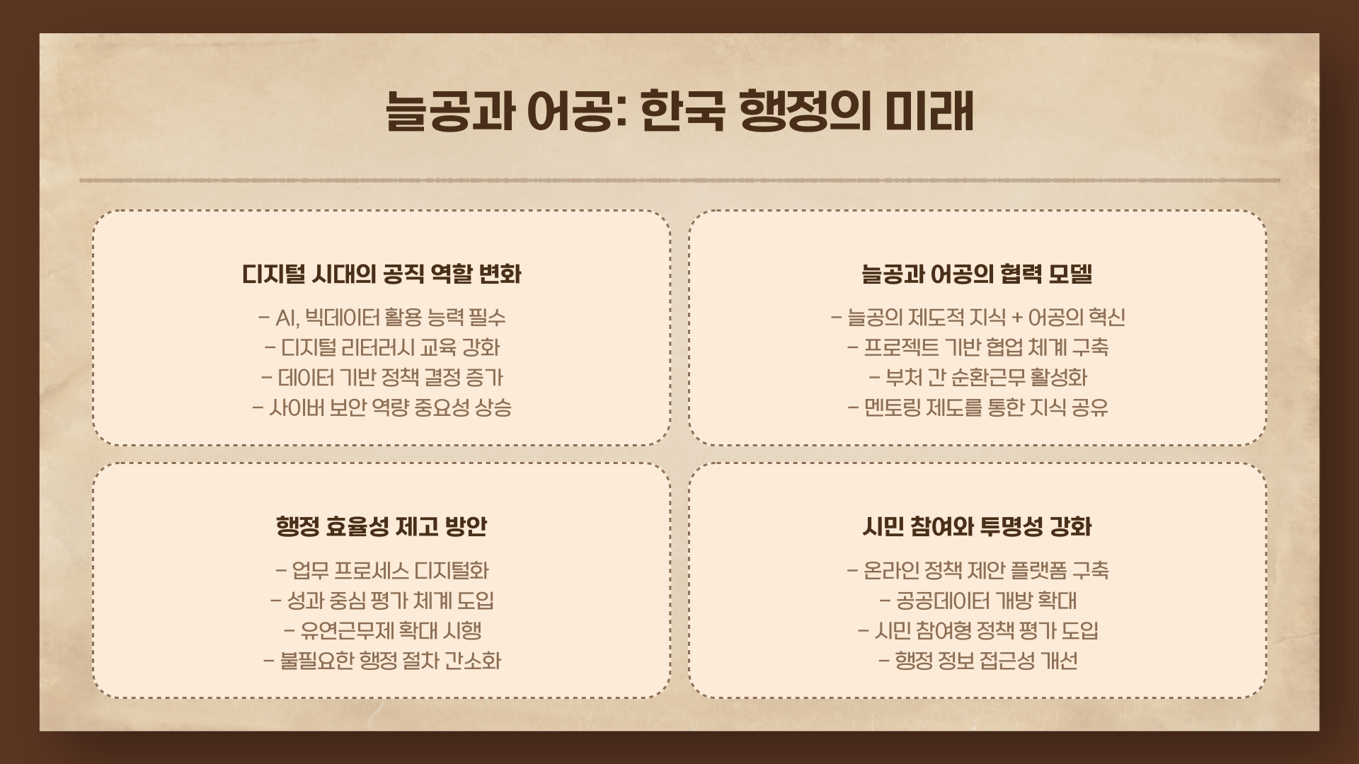하지만 결국에는 어공이 제시한 방향을 늘공이 현실적으로 풀어내는 구조가 되어야 정책이 제대로 작동하거든요. 서로의 역할을 인정하고 조화롭게 협력할 때, 공공서비스의 품질도 함께 높아지죠.