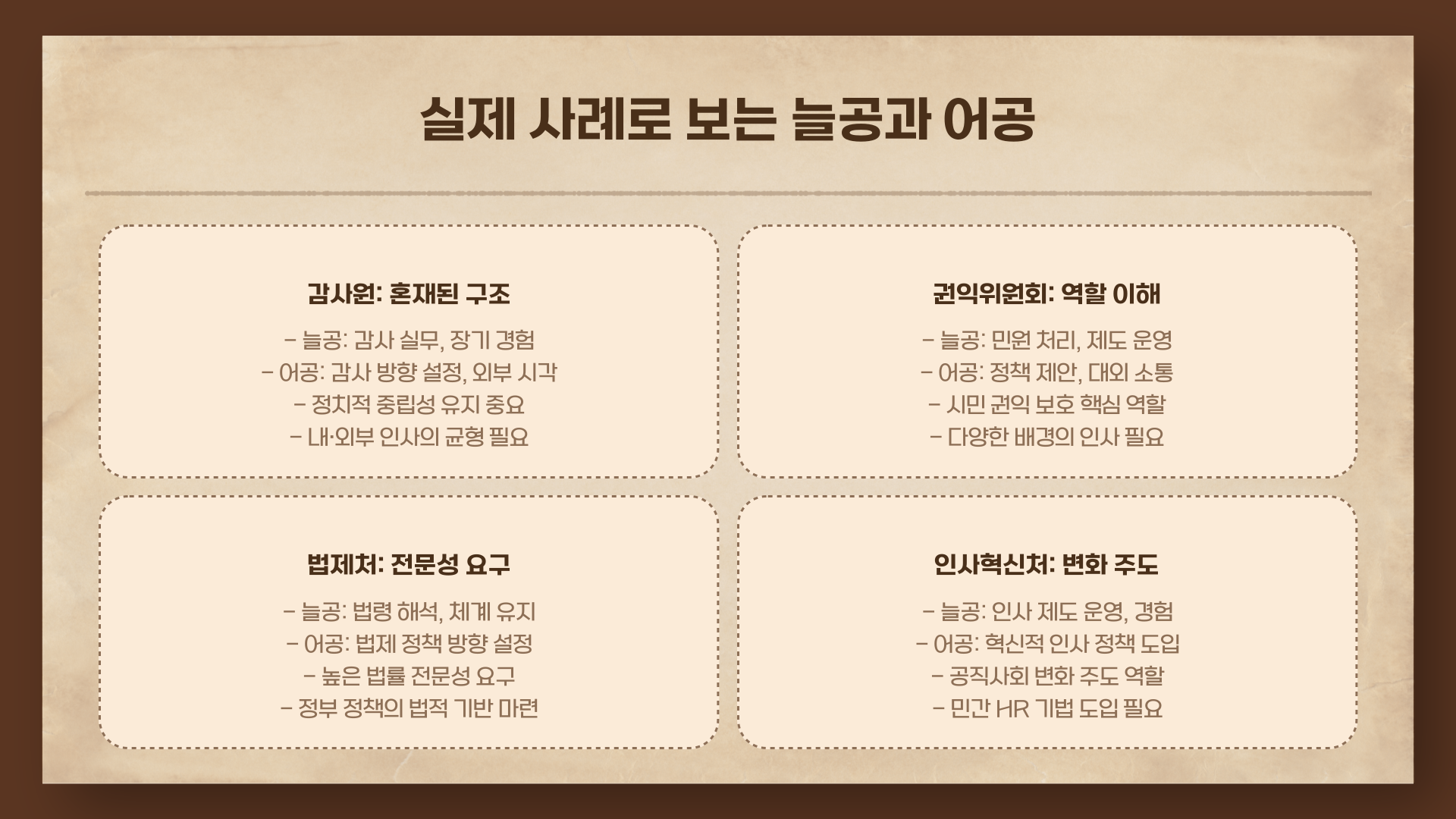 - 감사원이나 권익위원회는 어공과 늘공이 혼재된 구조예요. 정치적 중립성과 제도 전문성을 동시에 요구하니까요.