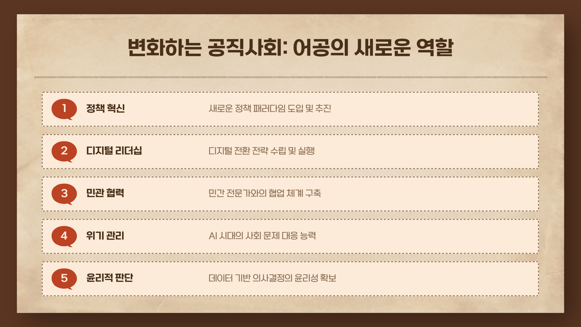 | 디지털 시대의 기대역할 | 디지털 시스템 운영자, 데이터 기반 행정 주도 | 디지털 정책 기획자, 민첩한 제도 실험가 |