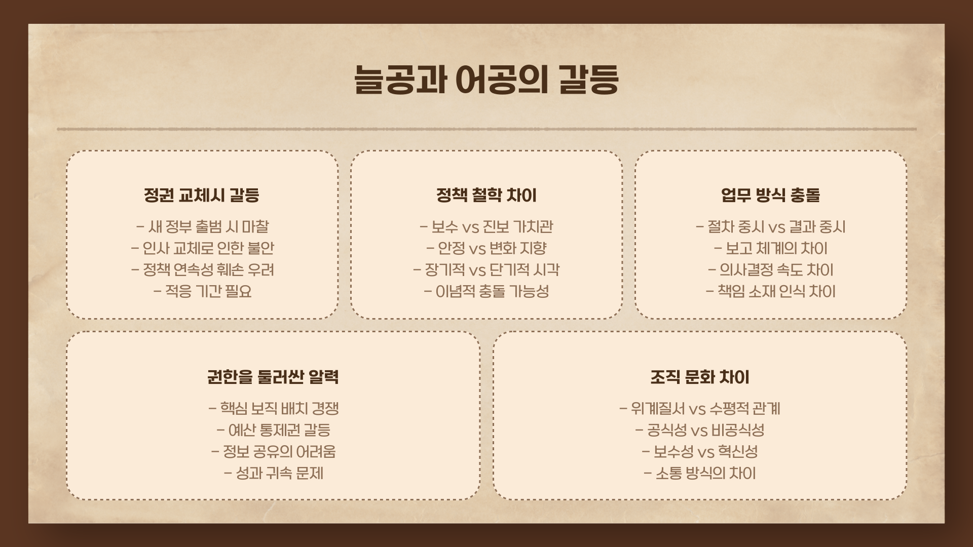 정권이 바뀔 때마다 새로운 어공들이 대거 유입되면서, 기존의 늘공들과 마찰이 생기는 경우가 많아요. 서로 다른 정책 철학, 업무 방식의 차이, 그리고 권한을 둘러싼 알력 싸움이 벌어지기도 하죠. 특히 어공들은 추진력을 강조하고, 늘공은 절차와 안정성을 중요하게 여기기 때문에 초반에는 충돌이 불가피해요.