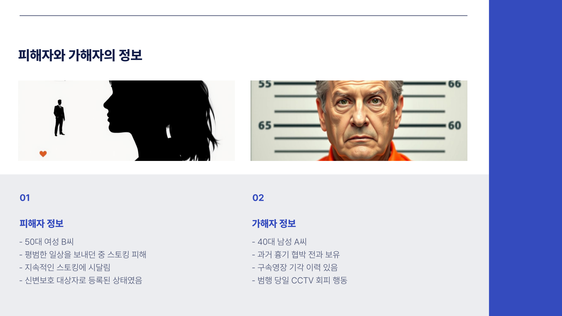 | 피해자 | 50대 여성, 스토킹 고통 호소, 신변보호 대상자 |
