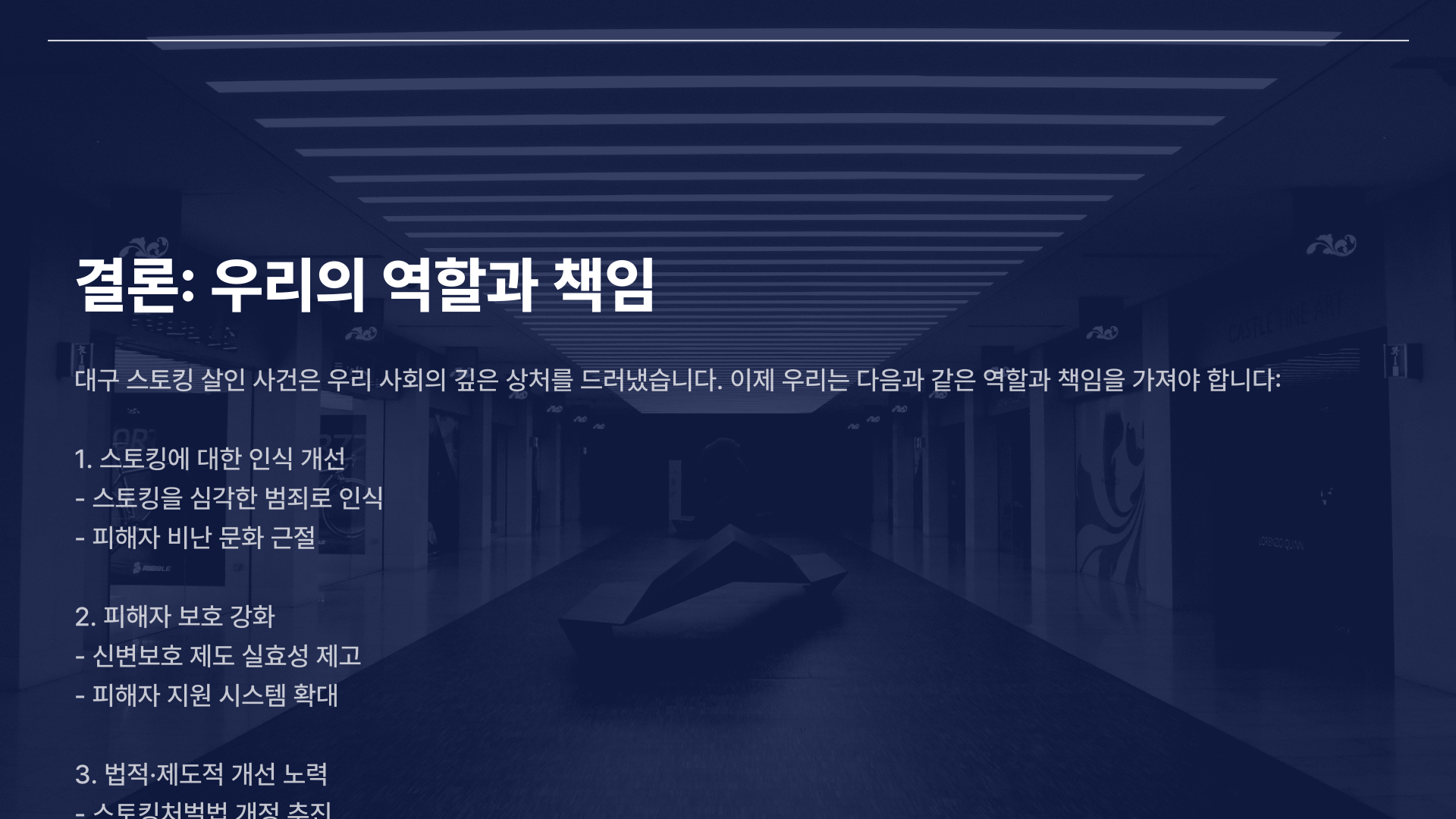 이번 사건은 스토킹에 대한 사회적 인식 전환이 시급하다는 사실을 일깨워줍니다. 단순한 애정 표현이나 관심이 아니라, 명백한 범죄이며 생명을 위협할 수 있는 심각한 행위라는 점을 분명히 해야 합니다. 사법기관의 대응 체계 강화는 물론, 피해자가 안심하고 도움을 요청할 수 있는 구조 마련이 필요합니다.