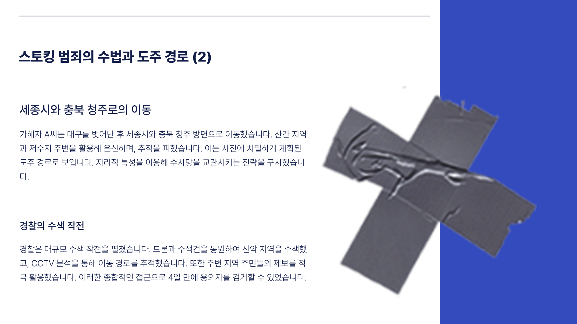 가해자 A씨는 경찰의 신변 보호 시스템을 회피하며 아파트 외벽 가스 배관을 타고 침입하는 충격적인 수법을 사용했습니다. 범행 직후에는 번호판 없는 오토바이를 타고 대구를 빠져나가, 세종시와 충북 청주로 이동했으며 산과 저수지를 거쳐 이동 경로를 숨겼습니다. 경찰은 드론, 수색견, CCTV를 동원해 수색을 확대했고, 결국 A씨를 나흘 만에 체포하는 데 성공했습니다.