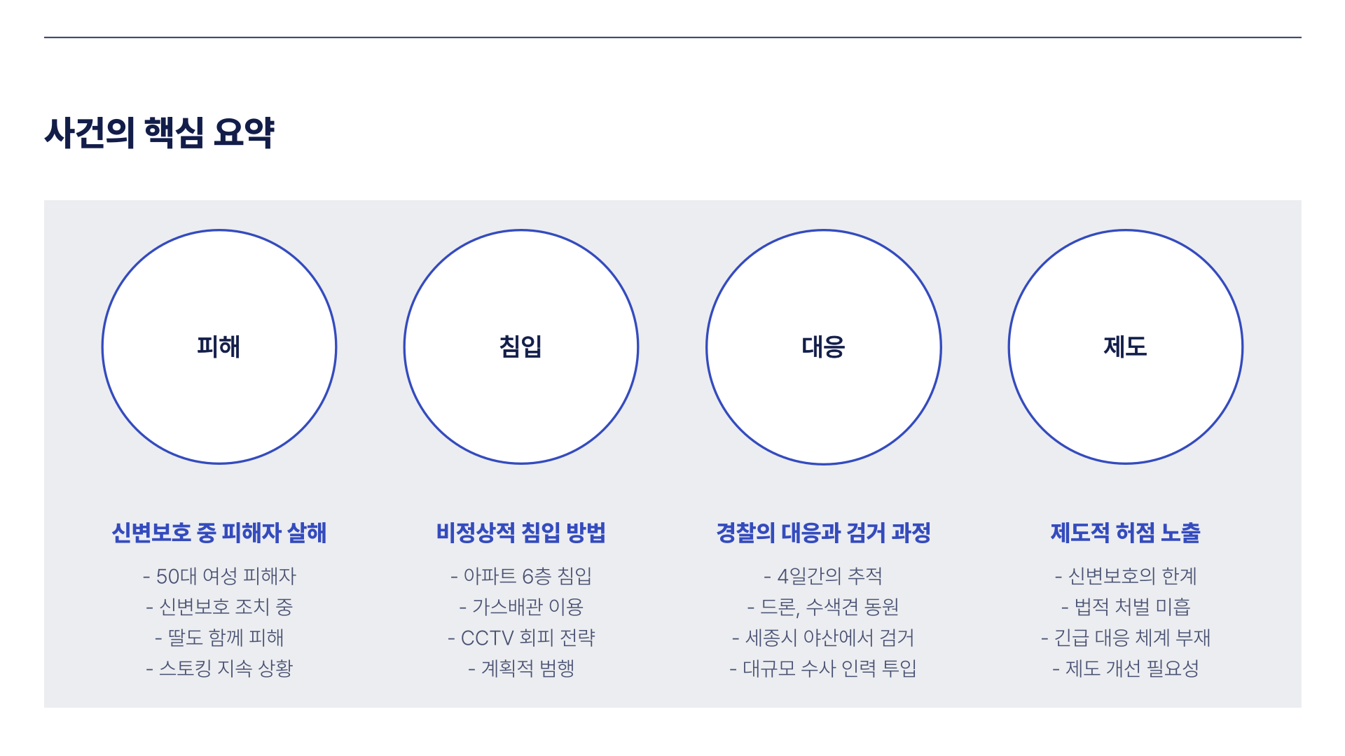 이번 사건은 피해자가 신변보호 대상자로 등록되어 있었음에도 비극을 피하지 못한 현실을 보여줍니다. 경찰은 스마트워치 지급, 순찰 강화, 112 시스템 연동 등의 조치를 시행했지만, 가해자의 엽기적인 침입 방식 앞에서 무력했습니다. 이는 현재 시스템이 물리적 접근을 완전히 차단하지 못하며, 고의적 회피 수법에 대응하기 어렵다는 한계를 드러냅니다.