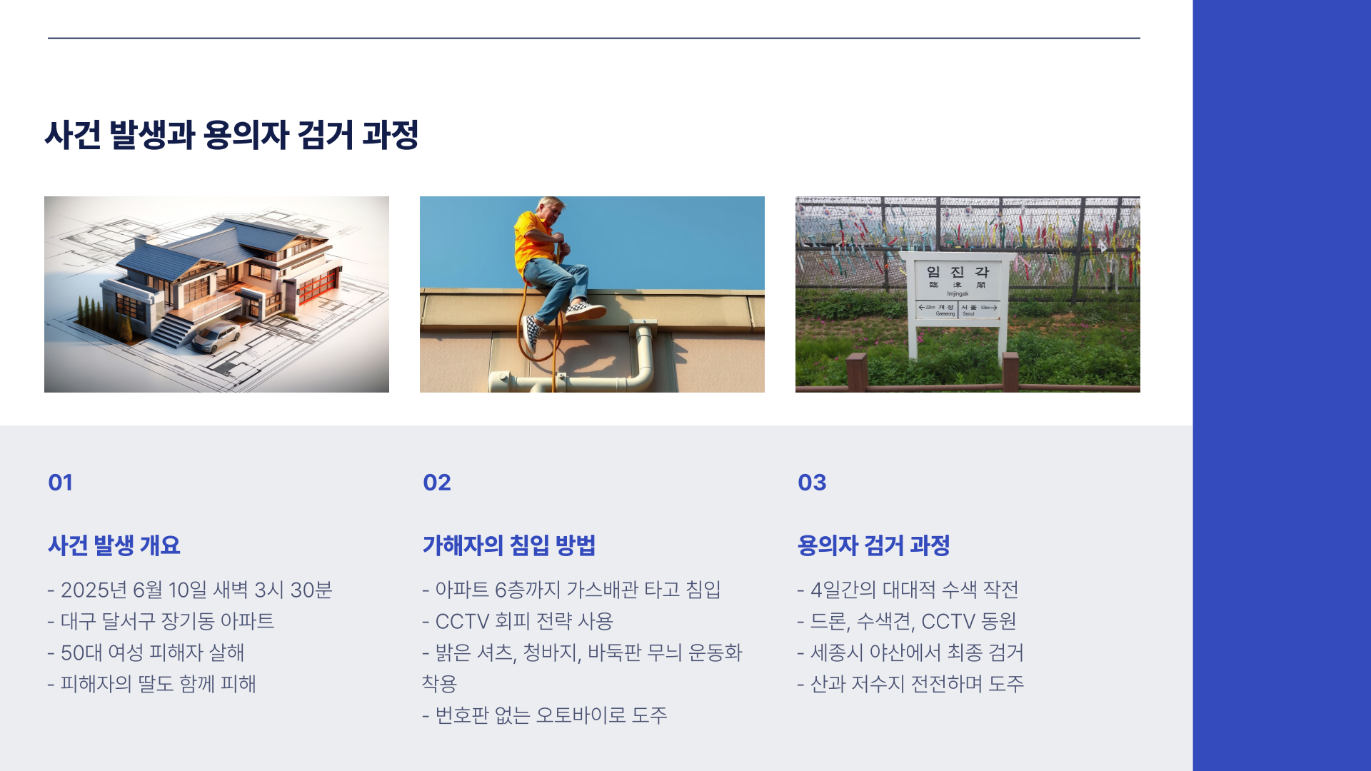 2025년 6월 10일 새벽, 대구 달서구의 한 아파트에서 벌어진 살인 사건은 전국을 충격에 빠뜨렸습니다. 가해자 A씨는 피해자 B씨의 집 6층까지 가스 배관을 타고 침입해 범행을 저질렀고, 딸 역시 함께 피해를 입는 비극이 벌어졌습니다. 사건 후 A씨는 도주했지만, 경찰은 4일간의 수색 끝에 세종시 야산에서 그를 검거했습니다. A씨는 수사망을 피해 산과 저수지를 전전하며 이동했고, 체포 당시엔 지인 창고 근처에 머물고 있었던 것으로 드러났습니다.