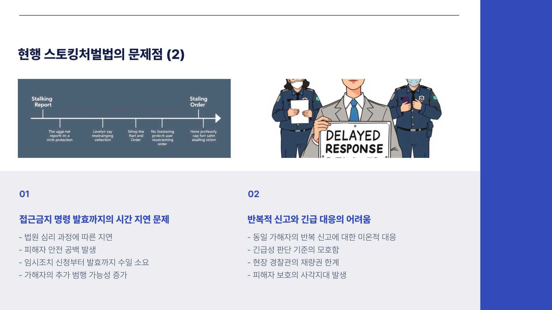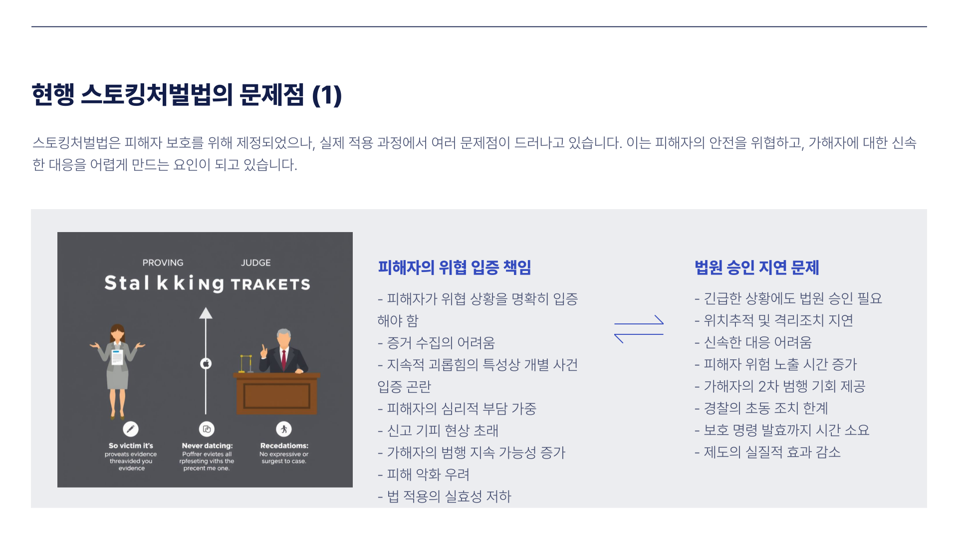스토킹처벌법은 피해자가 명확히 위협을 입증해야만 대응이 시작되는 구조로 설계되어 있습니다. 긴급한 대응이 필요한 상황에서도 법원 승인을 기다려야 하는 등 제도적 지연이 많습니다. 이로 인해 경찰의 초기 대응이 늦어지며, 피해자가 위험한 상황에 노출되기 쉽습니다. 특히 접근금지 명령이 내려지기까지 시간이 오래 걸리고, 반복적인 신고에도 무응답인 경우가 많다는 점이 지적되고 있습니다.