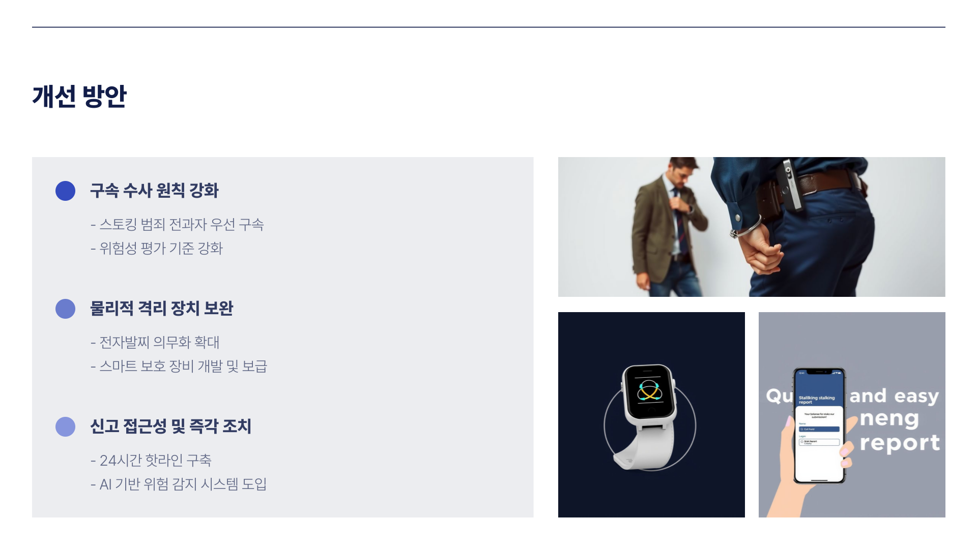 - 피해자의 신고 접근성 개선과 신고 후 즉각 조치 제도화