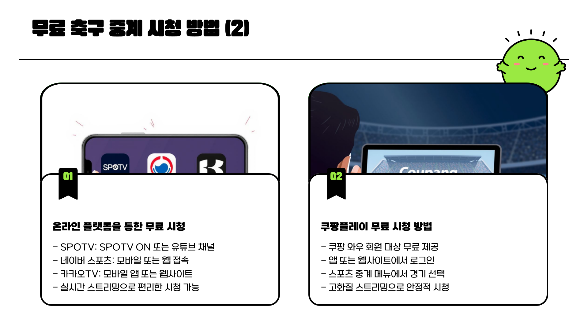 | 네이버 스포츠 / 카카오TV | 모바일이나 웹에서 무료로 접속해 스트리밍 가능 |