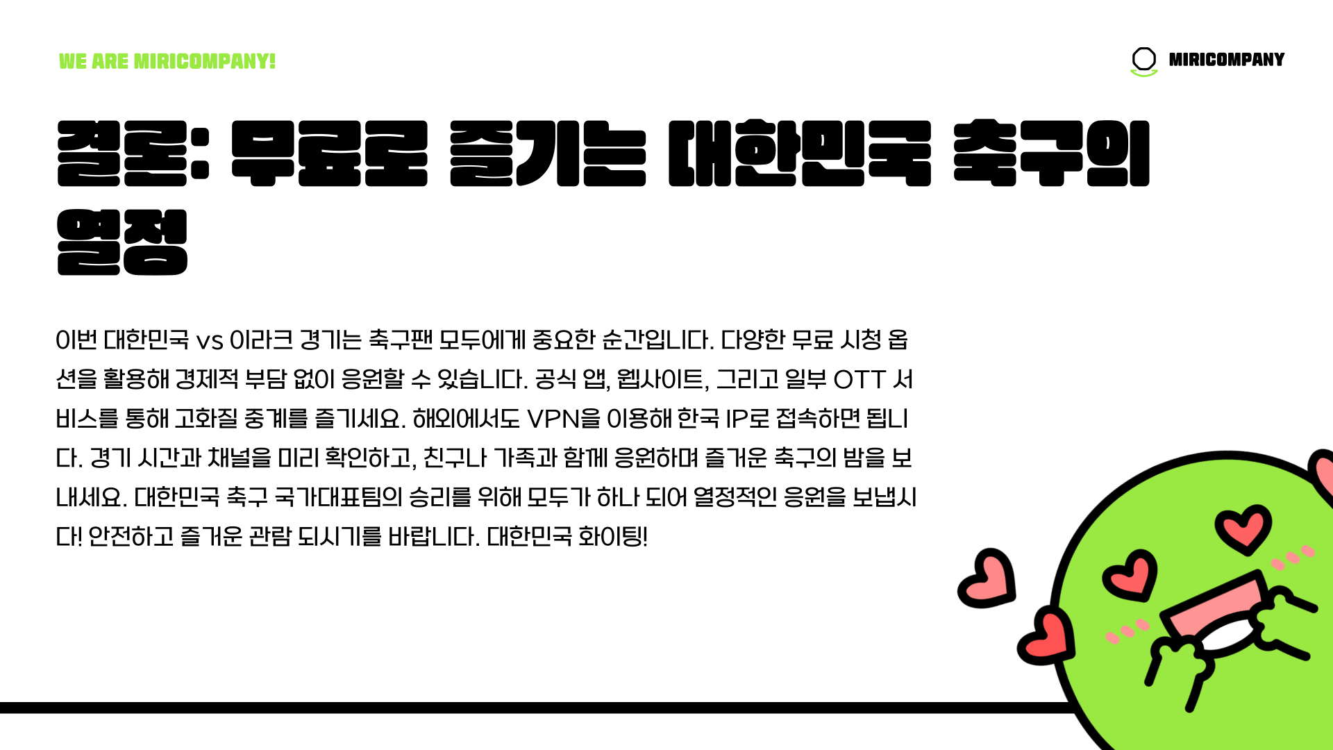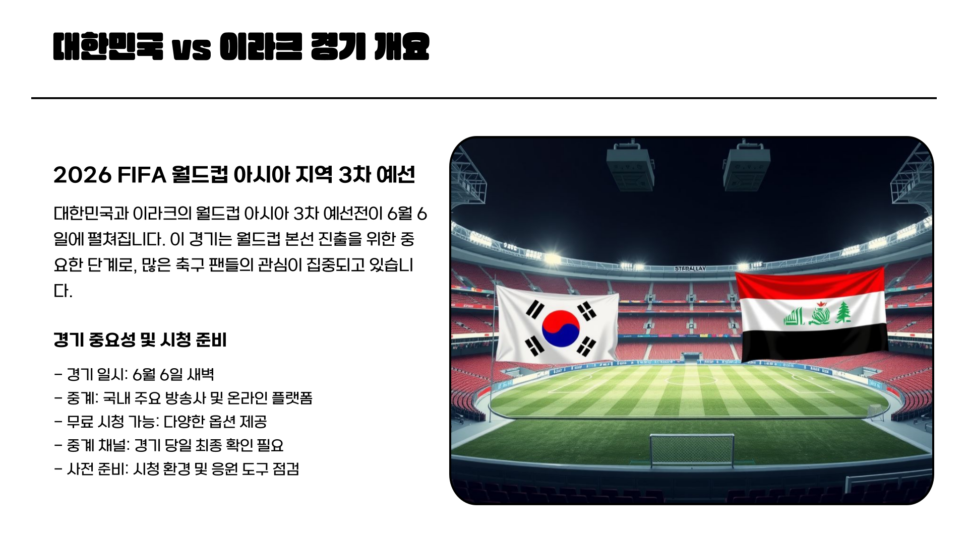6월 6일 새벽, 대한민국과 이라크가 펼치는 아시아 월드컵 예선전. 놓치면 안 되는 이 경기를 무료로 시청할 수 있는 모든 방법을 알려드립니다. 축구팬이라면 지금 집중하세요!