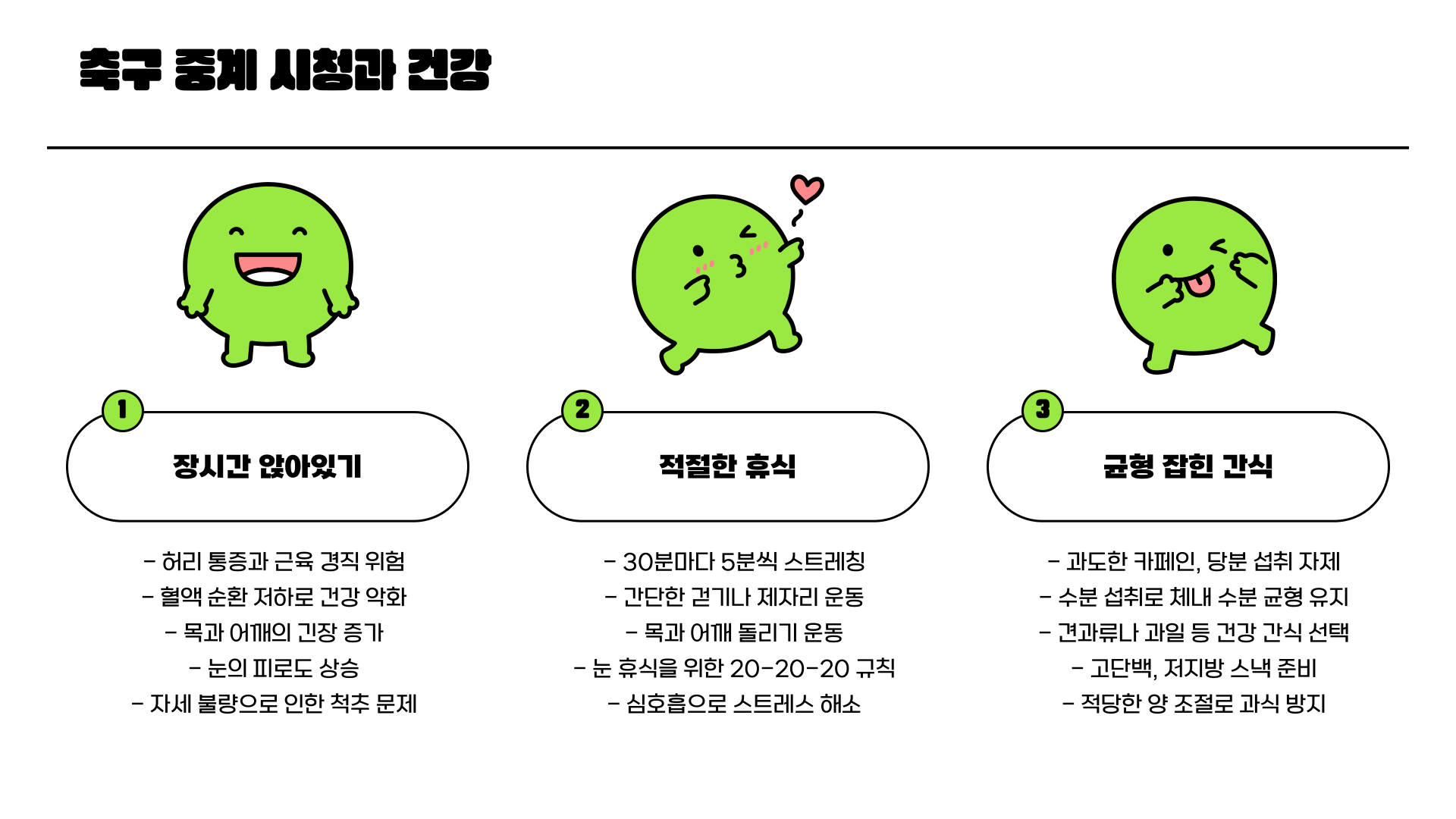 | 간식 & 음료 | 치킨, 맥주, 과자 준비는 기본! 새벽 경기엔 커피도 좋아요. |