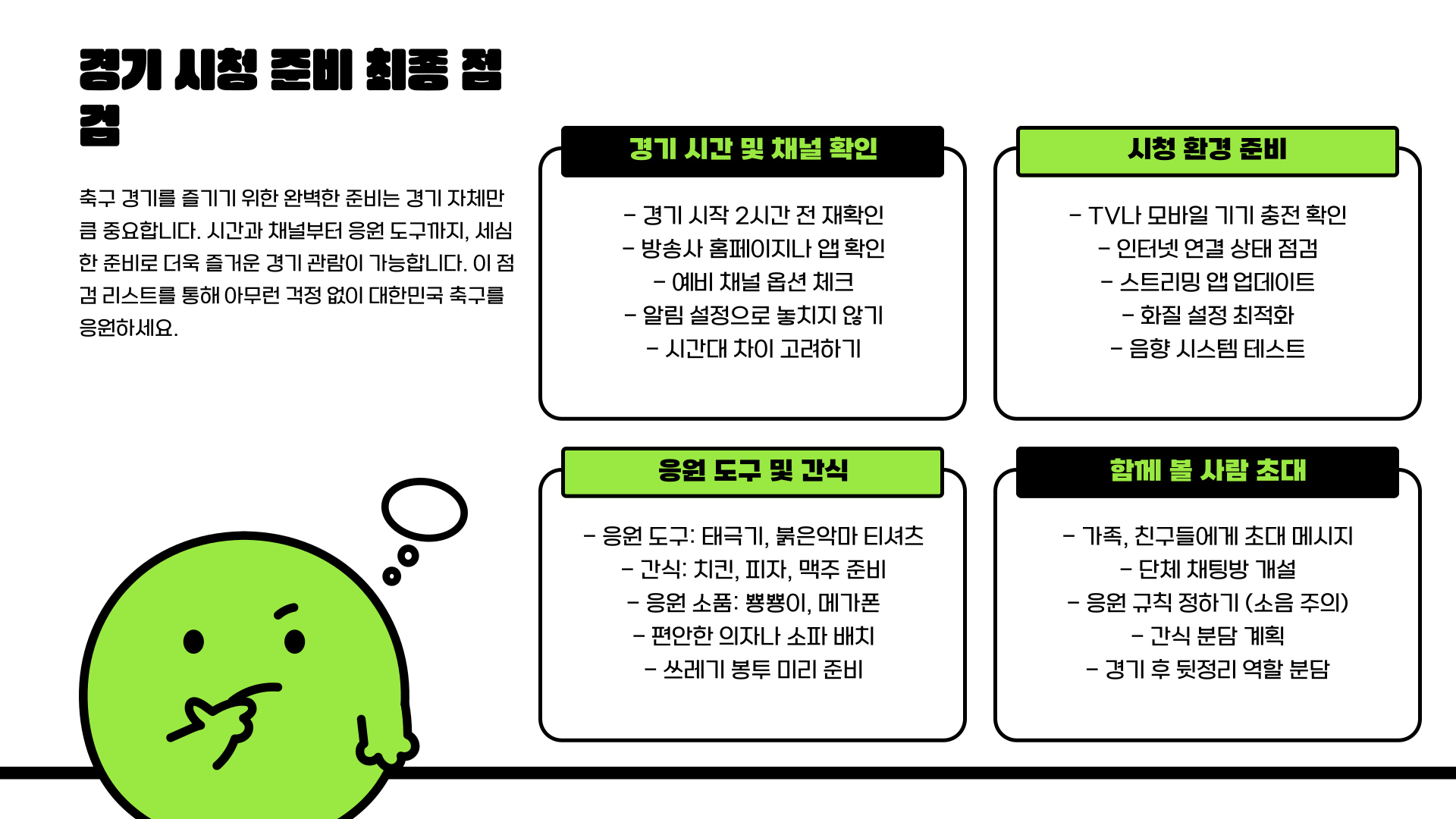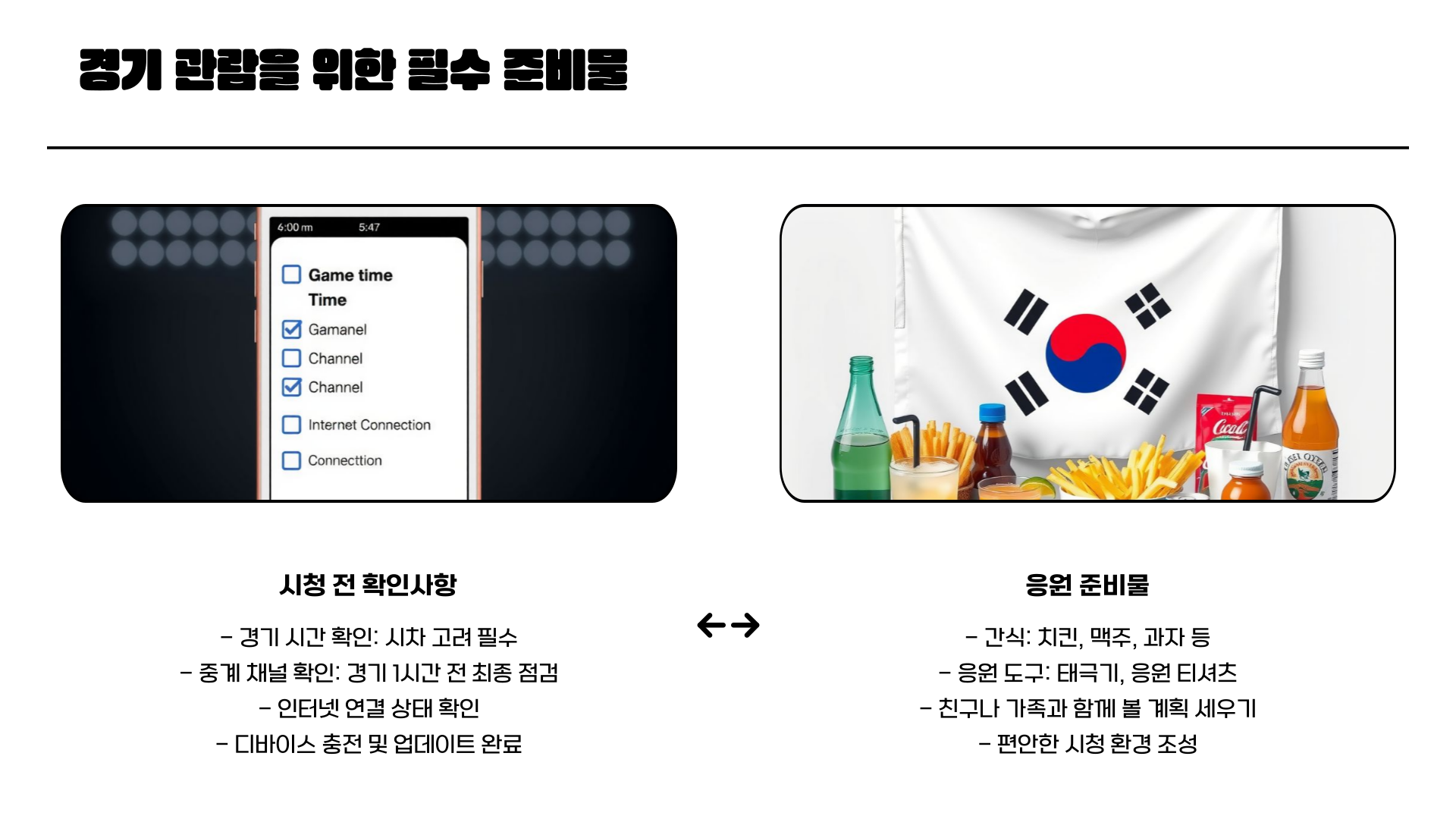 경기를 시청하는 것도 일종의 이벤트입니다. 제대로 즐기기 위해서는 환경을 미리 갖춰두는 게 중요하죠. 아래 항목을 체크하며 준비해보세요.