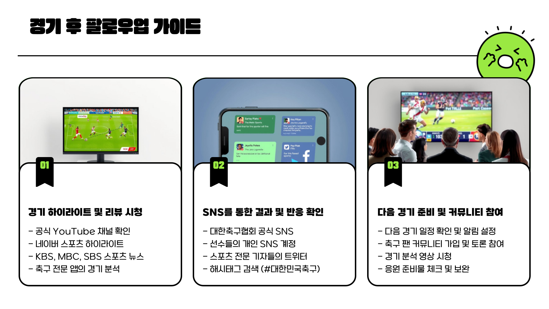여러분만의 시청 팁이나 예상 스코어가 있다면 댓글로 나눠주세요. 함께 이야기 나누며 응원의 열기를 더해보아요. 이번 경기, 다 같이 뜨겁게 응원해봐요! 🇰🇷⚽🔥
