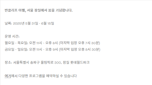 이번 반클리프 아펠 전시는 2025년 5월 31일부터 6월 15일까지 서울 잠실 롯데월드몰에서 열려요.