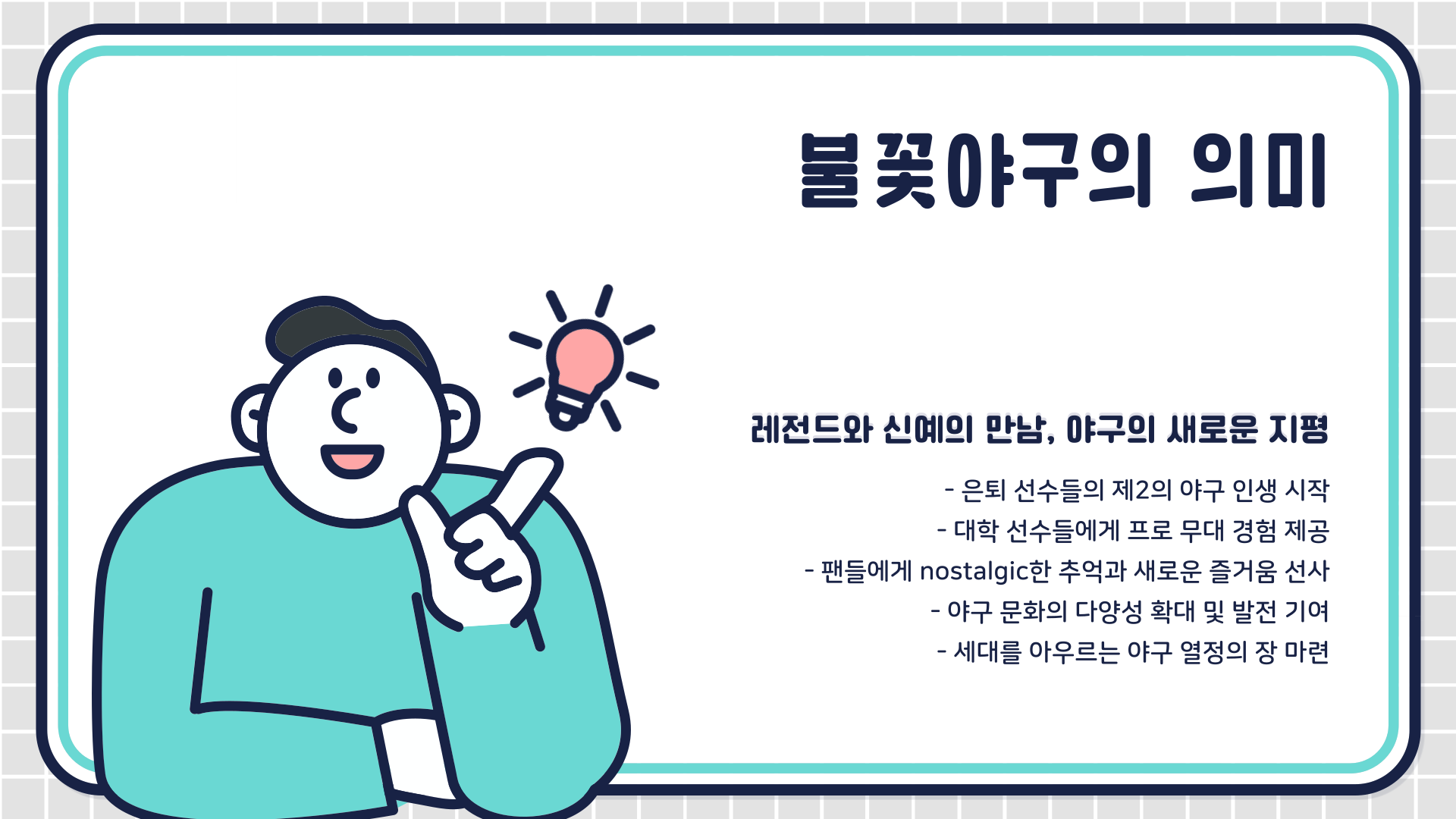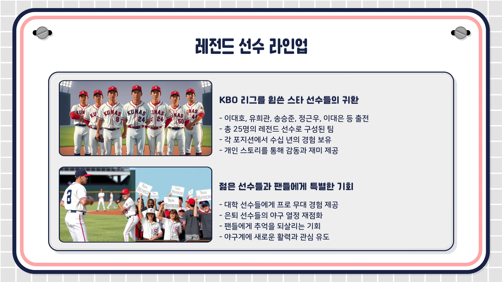 불꽃야구팀은 이름만 들어도 전율이 흐르는 KBO 레전드들로 구성되어 있어요. 은퇴 후에도 여전히 야구에 대한 열정을 간직한 선수들이 다시 유니폼을 입는다는 건 팬들에게 정말 큰 감동이죠. 이들과 맞붙는 인하대 야구부는 실력을 입증할 최고의 기회로 삼고 있다고 해요.