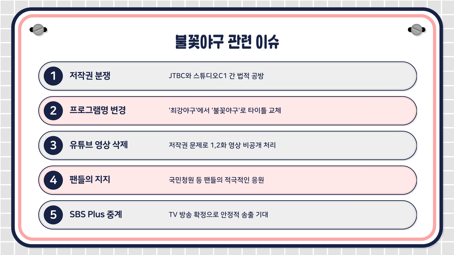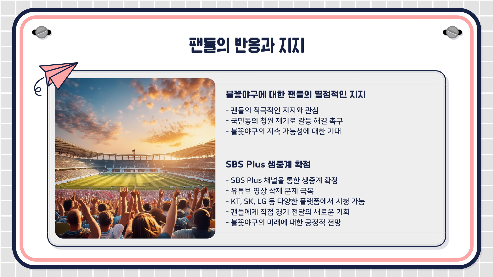현장을 찾지 못해도 괜찮아요. SBS Plus와 유튜브를 통해 생중계로 즐길 수 있답니다. 이번 경기는 불꽃 파이터즈의 첫 생중계 경기라는 점에서 더욱 뜻깊어요. 집에서 치킨과 함께 응원하면서 보는 그 맛, 다들 아시죠?