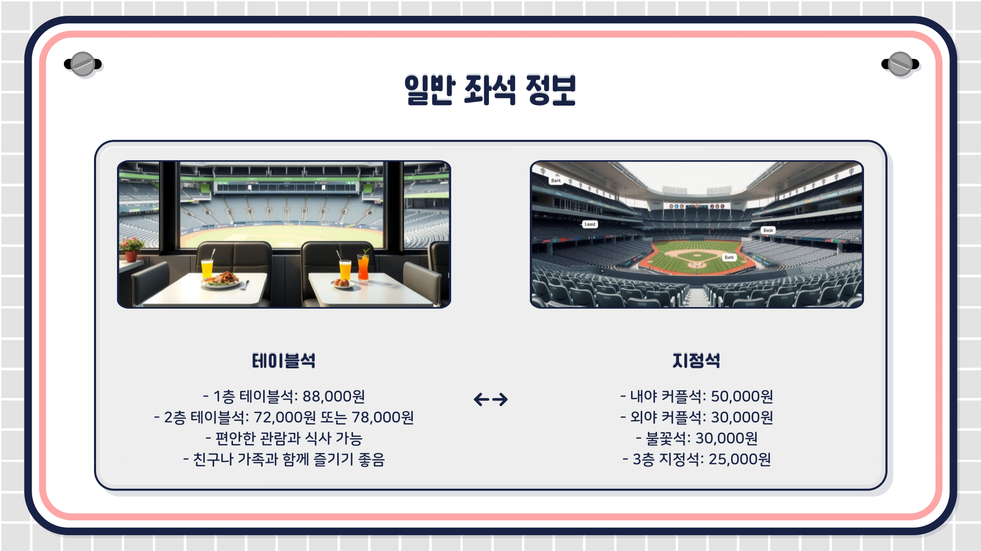 - 테이블석 – 1층 88,000원 / 2층 72,000~78,000원 / 편하게 야구 즐기기