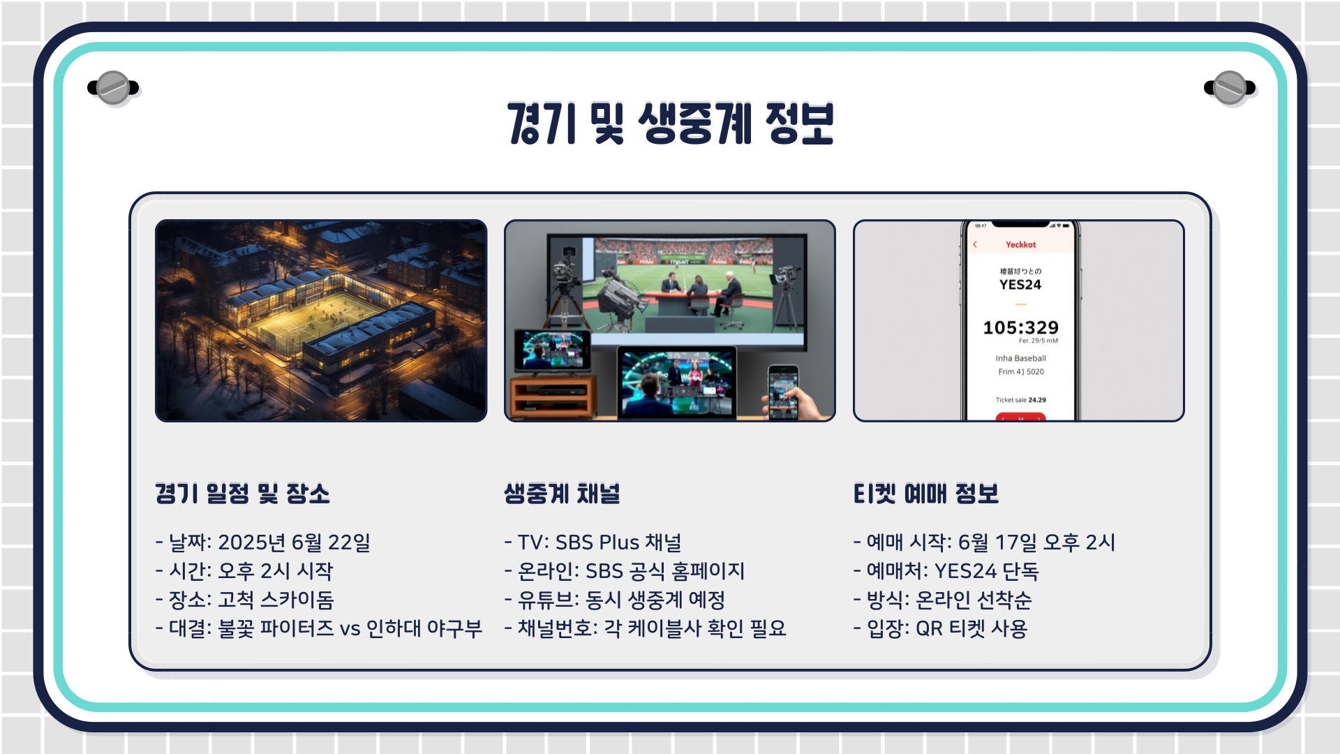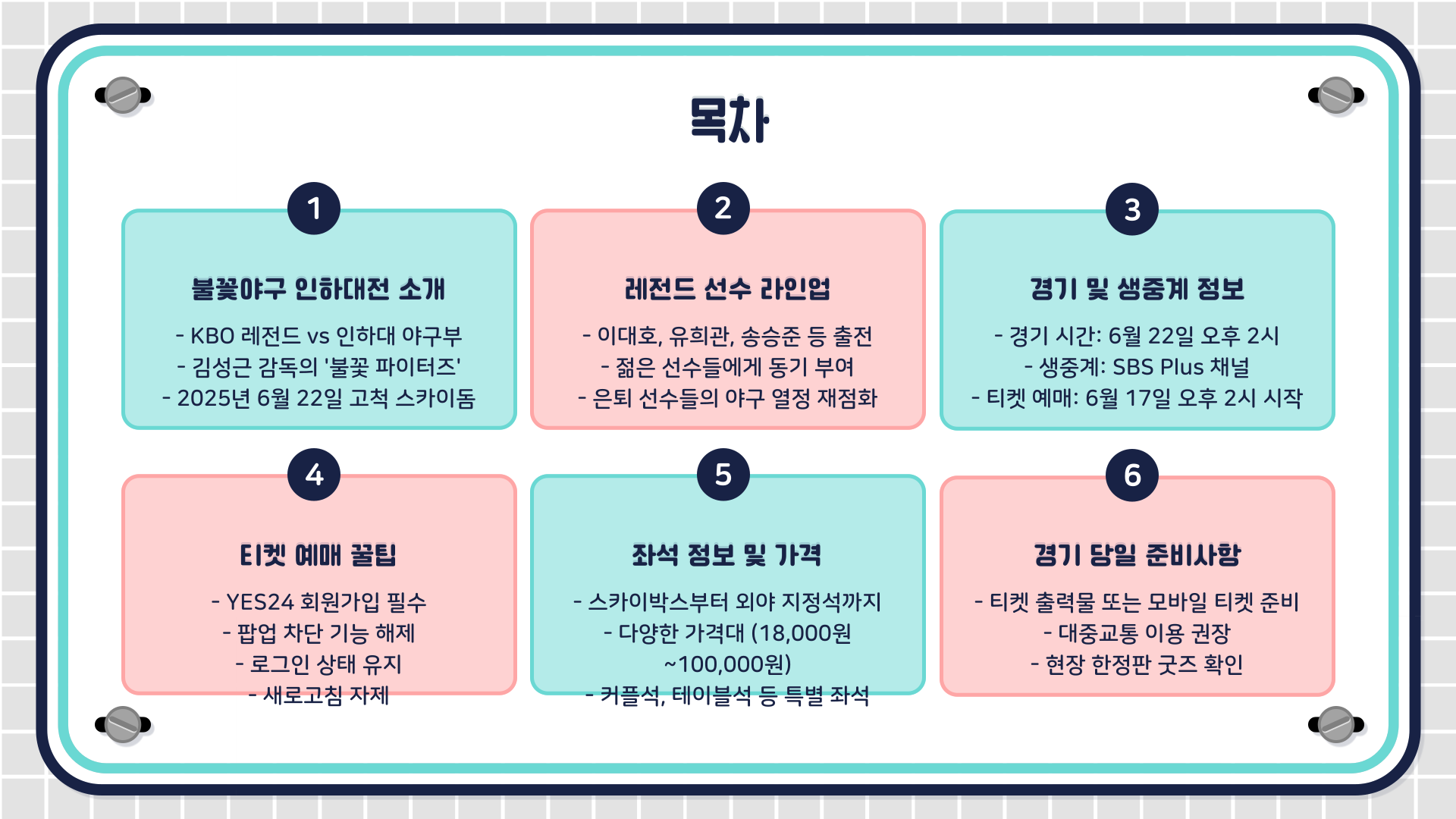 여러분 안녕하세요! 요즘 야구 시즌 정말 뜨겁죠? 저도 평소엔 프로야구만 챙겨보는데, 이번엔 정말 색다른 경기가 열린다고 해서 흥분을 감출 수가 없었어요. 바로 '불꽃야구 인하대전'입니다! 은퇴한 KBO 레전드들이 다시 유니폼을 입고, 인하대학교 야구부와 맞붙는다고 하니 이건 진짜 놓치면 평생 후회할 이벤트잖아요? 저도 예매 일정 달력에 딱 표시해놓고 기다리고 있답니다. 오늘은 이 경기를 더 스마트하게 즐기기 위한 예매 꿀팁부터 좌석 정보, 생중계까지 알차게 알려드릴게요.