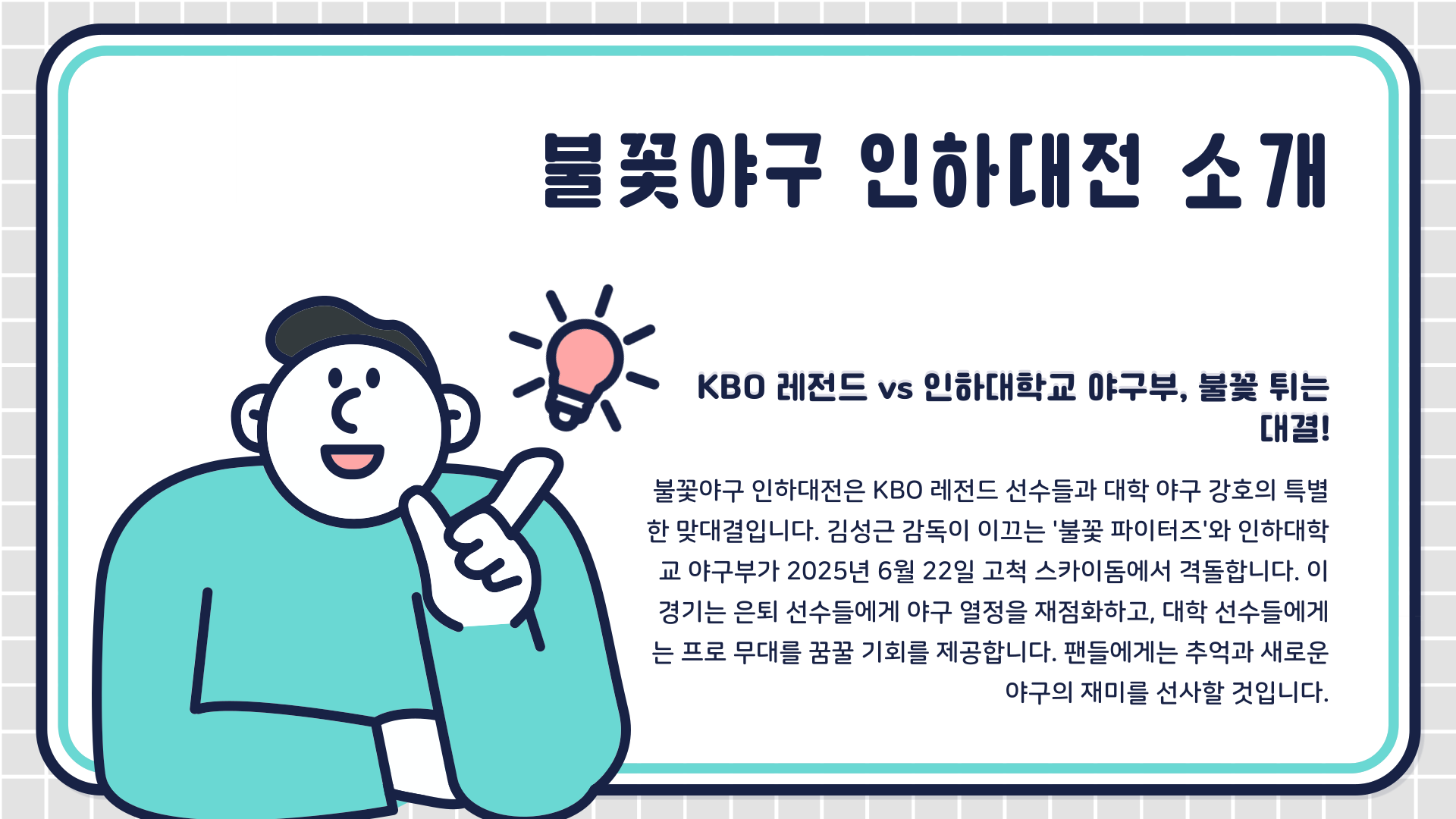 야구 팬이라면 절대 놓칠 수 없는 경기가 바로 6월 22일 고척 스카이돔에서 열리는 ‘불꽃야구 인하대전’이에요. 이 경기는 레전드 선수들과 대학 최강팀이 맞붙는 특별한 승부로, 김성근 감독이 이끄는 ‘불꽃 파이터즈’와 인하대학교의 야구부가 맞붙는 대결이에요. 레전드와 루키가 만나는 무대, 그 자체로 드라마죠. 젊은 선수들에게는 꿈의 무대, 팬들에게는 황금기 야구의 부활을 만나는 순간이에요.