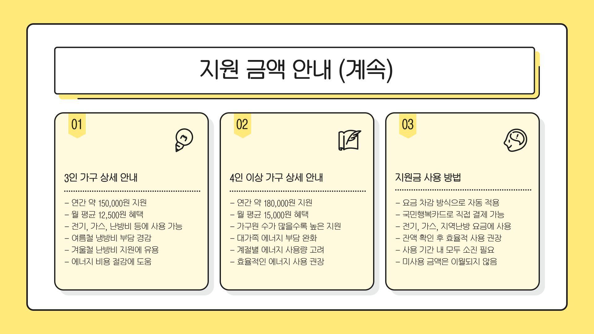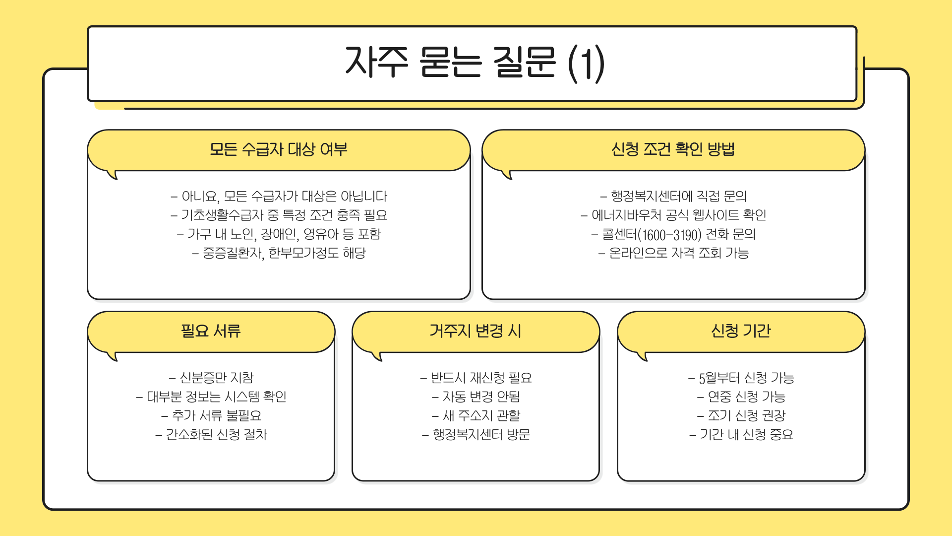 | 수급 자격 | 국민기초생활보장법상 기초생활수급자로 등록된 가구 |