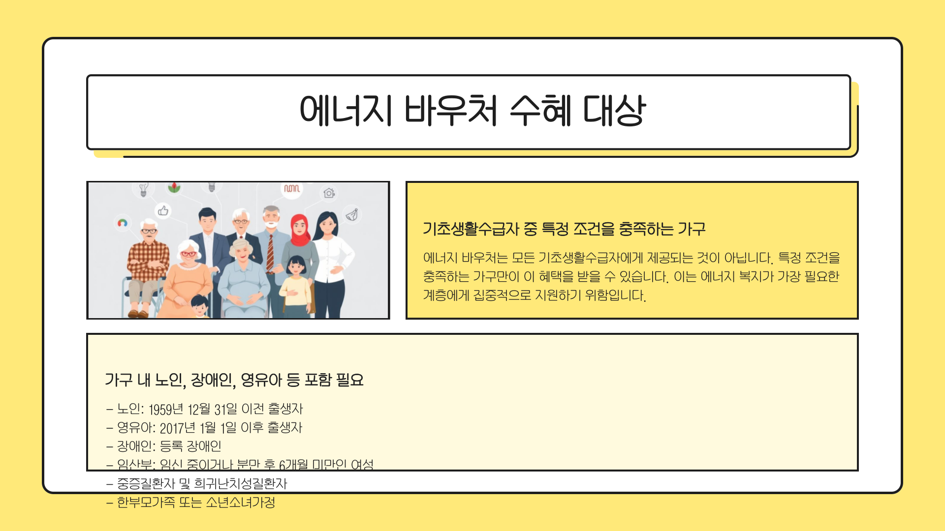 | 가구 내 구성원 | 노인, 장애인, 7세 이하 유아, 임산부, 중증 질환자, 한부모, 소년소녀가정 중 1명 이상 포함 |