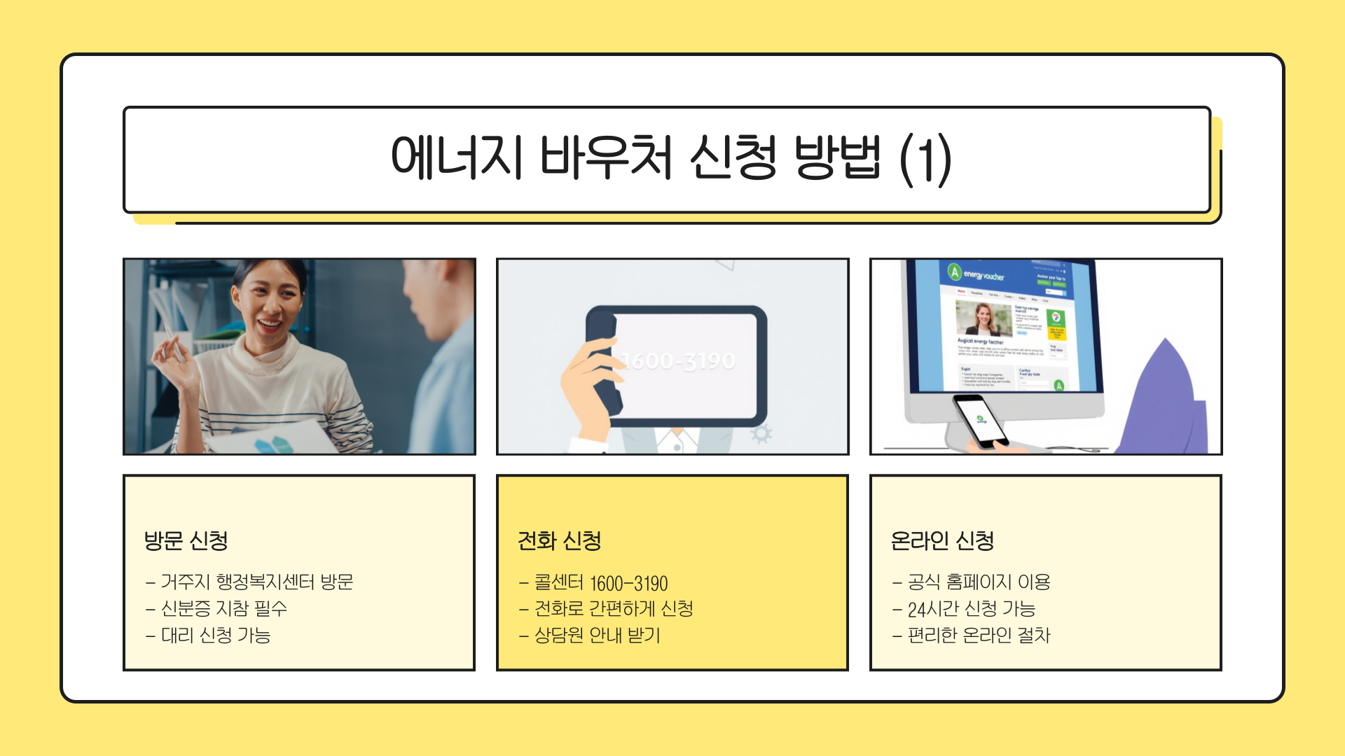 | 전화 접수 | 콜센터 1600-3190 연결 후 신청 가능 |