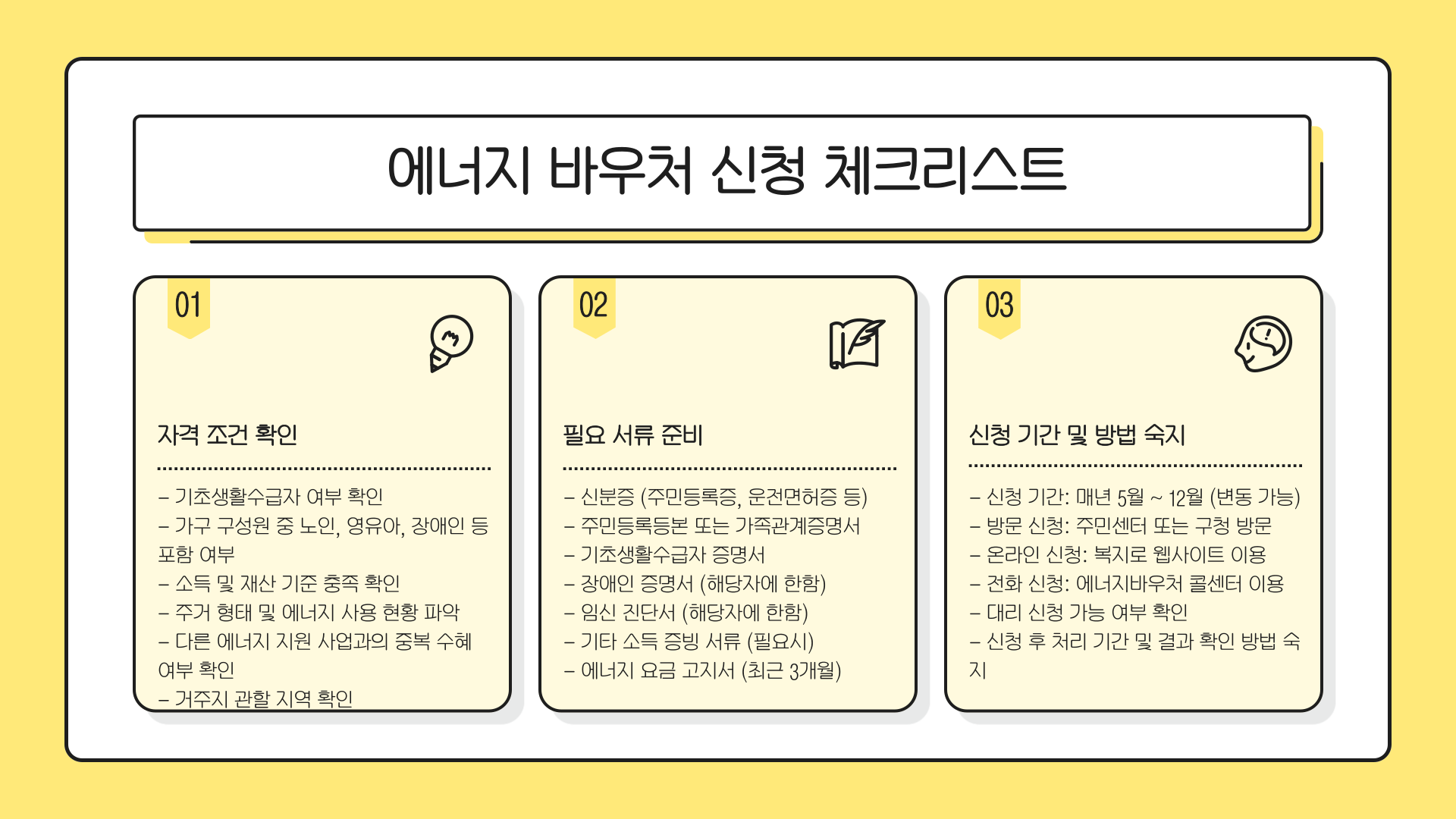 에너지 바우처 신청은 생각보다 어렵지 않아요. 오프라인이나 온라인, 전화 등 다양한 경로를 통해 손쉽게 신청할 수 있습니다. 단, 신청 기간은 반드시 지켜야 하니 달력에 체크해두세요.