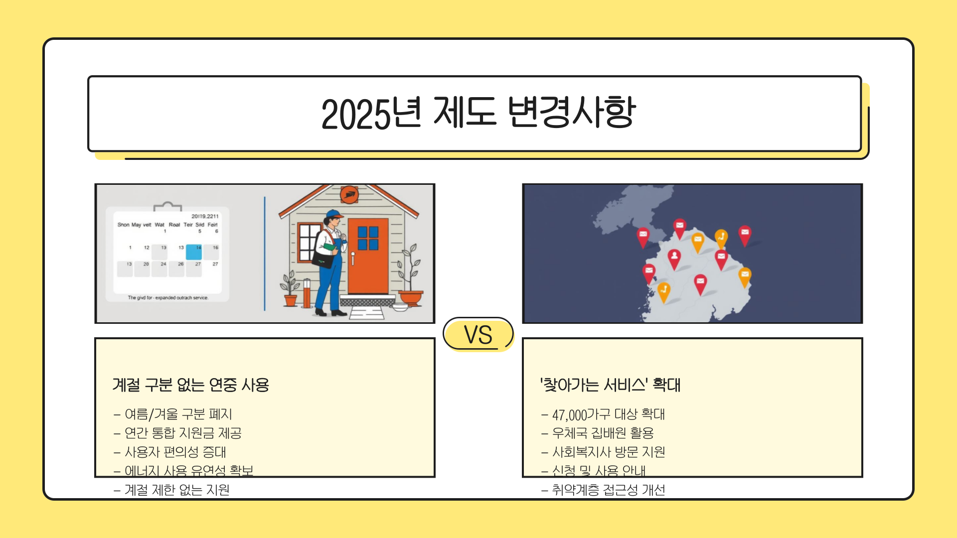 다가오는 2025년부터는 이상기후 대응을 위해 바우처 운영 방식이 몇 가지 바뀝니다. 여름과 겨울로 나뉘었던 금액이 하나로 통합되고, 직접 찾아가서 알려주는 복지 서비스도 확대될 예정이에요.