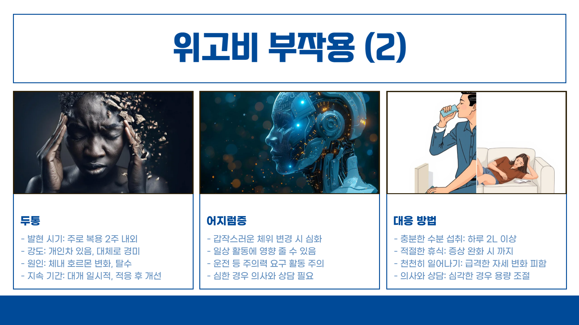 | 두통, 어지럼증 | 2주 내외 | 충분한 수분 섭취, 휴식 |