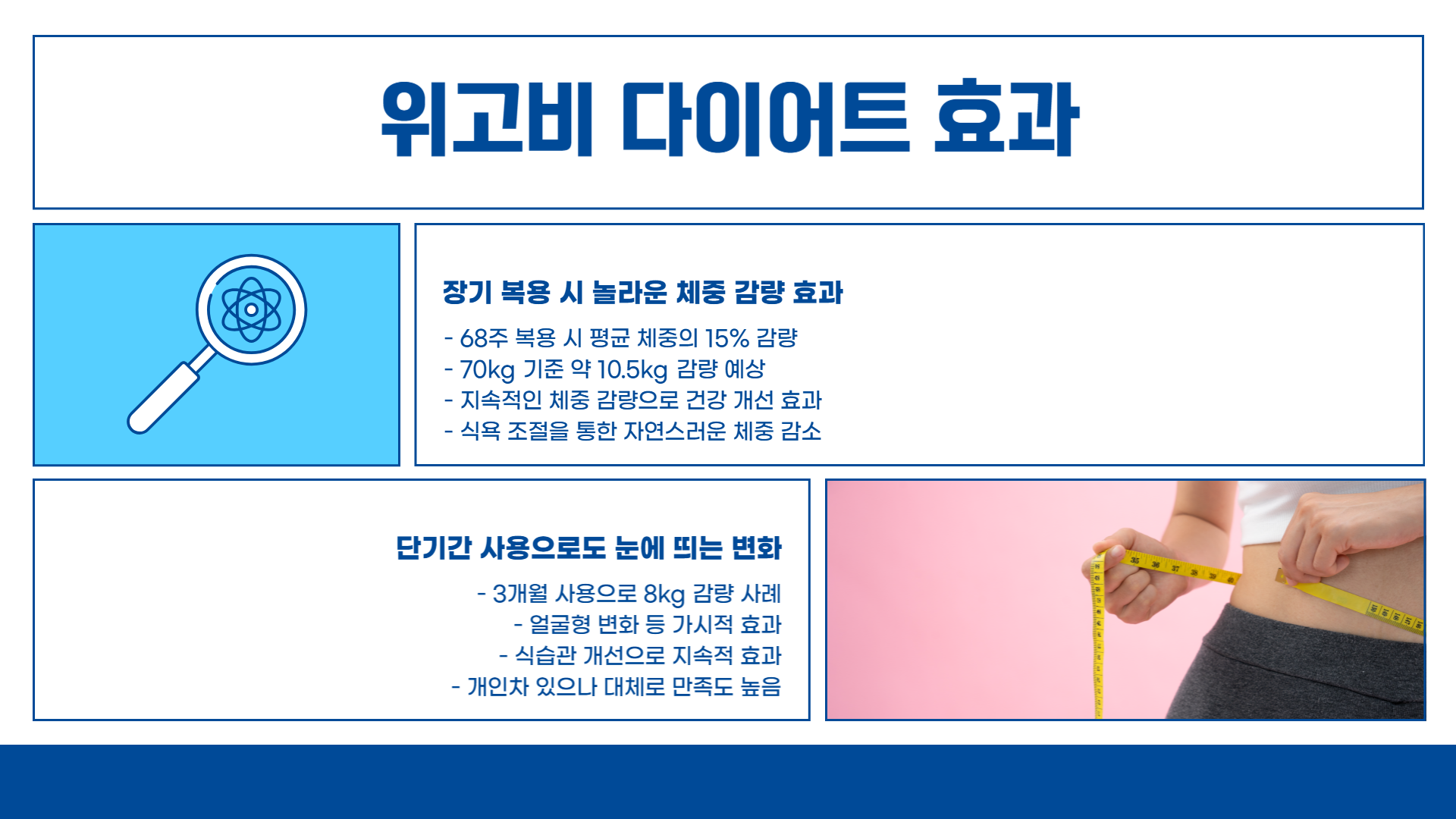위고비는 미국 FDA에서도 승인받은 GLP-1 계열 주사제예요. 간단히 말하면 식욕을 확 줄여주는 역할을 한다고 보면 되죠. 평균적으로 68주 복용 시 체중의 약 15%가 감량된다는 임상 결과가 있어요. 예를 들어, 70kg 기준이면 약 10.5kg 정도 빠지는 셈이죠. 제 친구도 3개월 동안 식단이랑 병행해서 8kg 정도 감량했는데, 정말 얼굴형이 바뀌었더라구요.