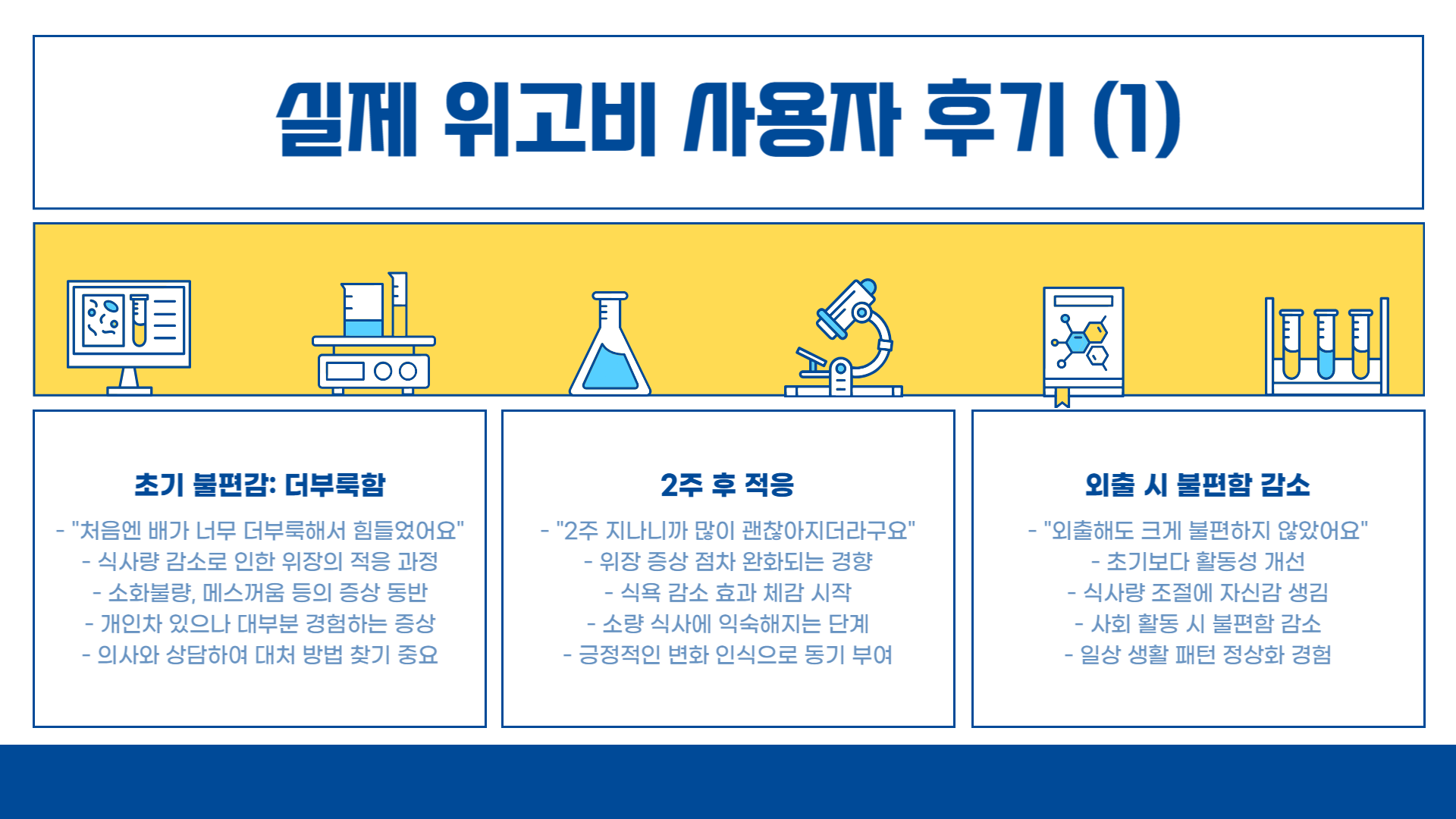 “처음엔 배가 너무 더부룩해서 외출 자체가 힘들었어요. 그런데 2주 지나니까 괜찮아지더라구요.” – 위고비 4주차 후기 중