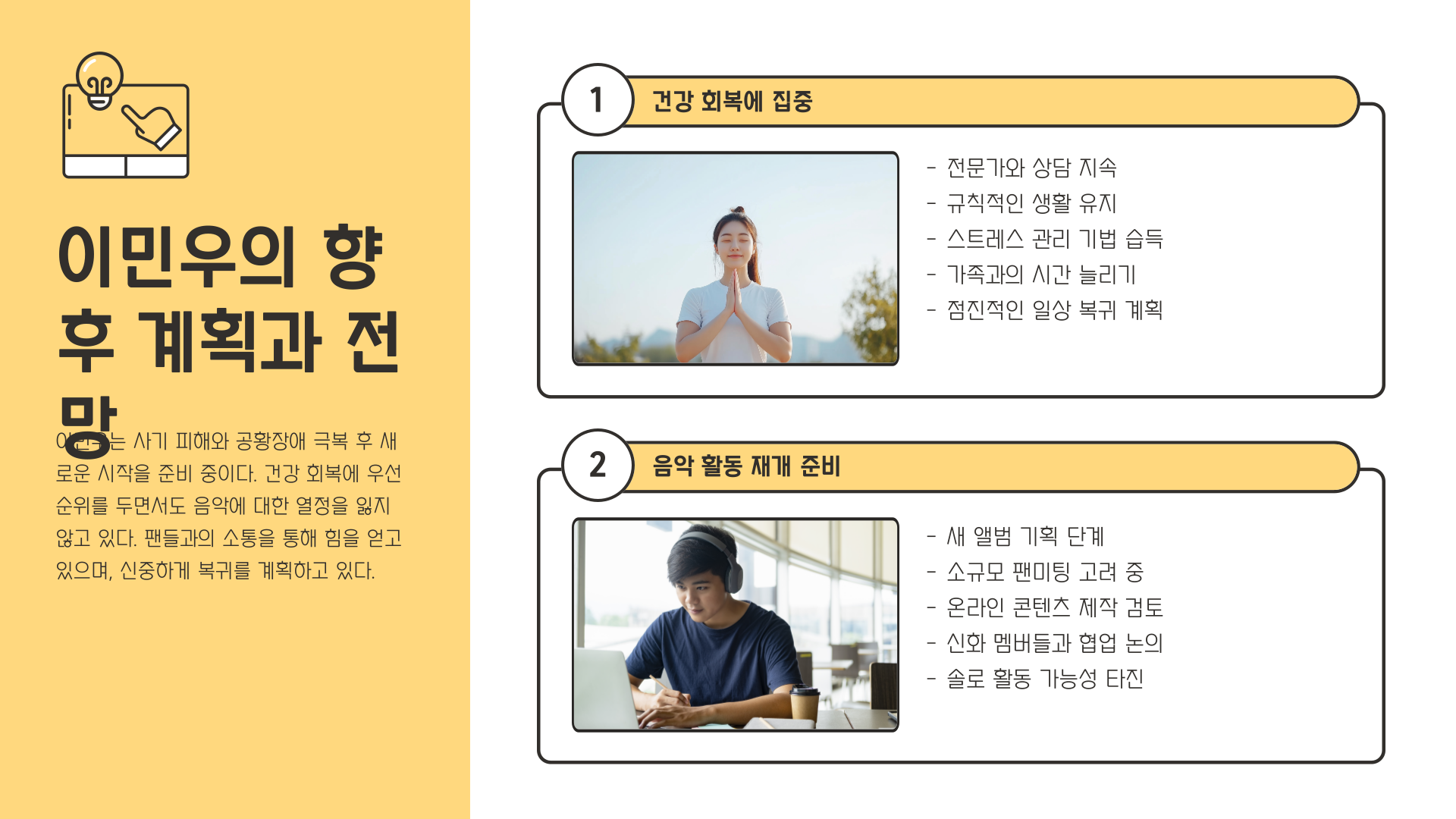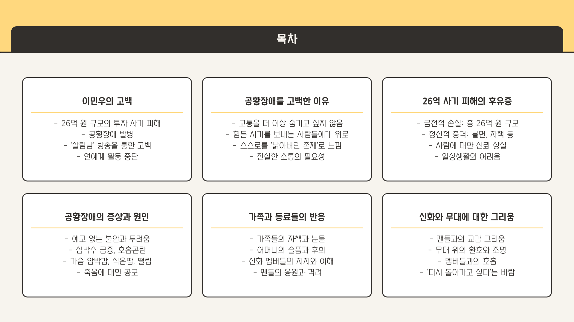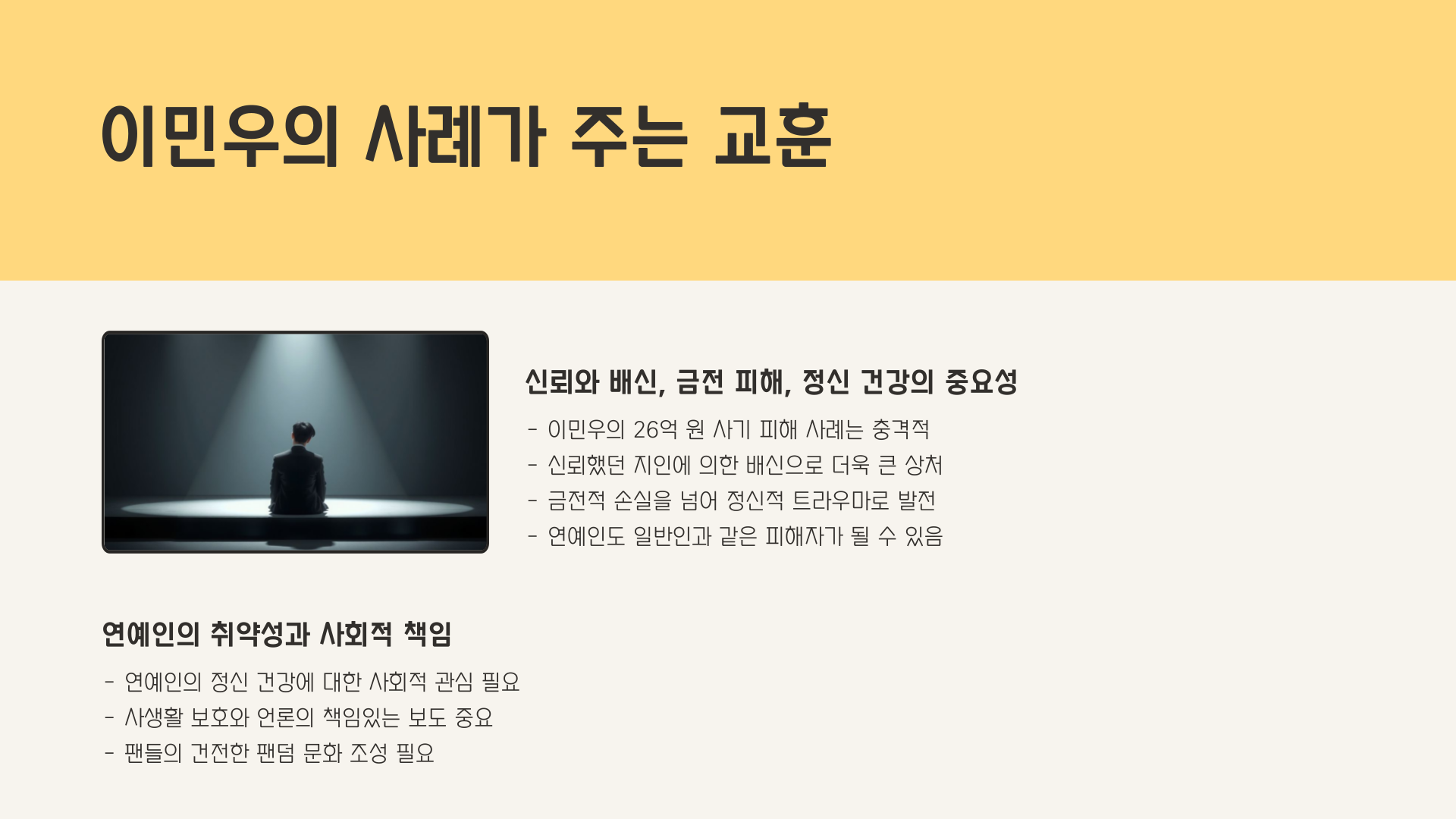 믿었던 사람에게서 받은 배신은 상상 이상이었고, 그 결과 이민우 씨는 정신적으로 깊은 상처를 입었습니다. 금전적인 피해뿐 아니라 사람에 대한 신뢰마저 깨져버렸죠. 심지어 팬들과 만나는 자리에서도 갑작스러운 공황 증상으로 인해 자리를 피해야 할 때가 있었다고 합니다.
