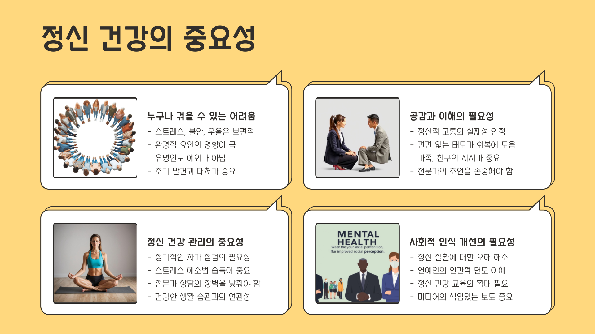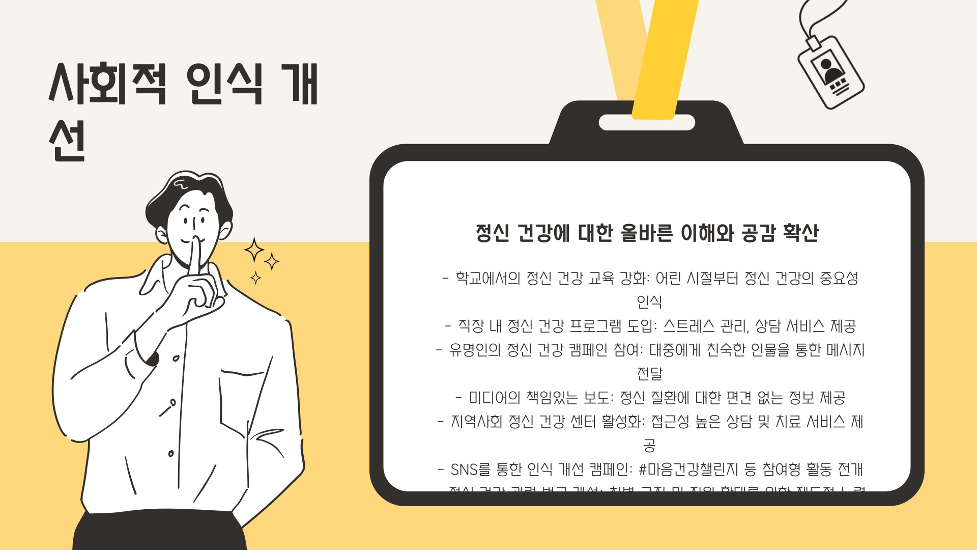 - 정신질환에 대한 편견 해소를 위한 캠페인 확대
