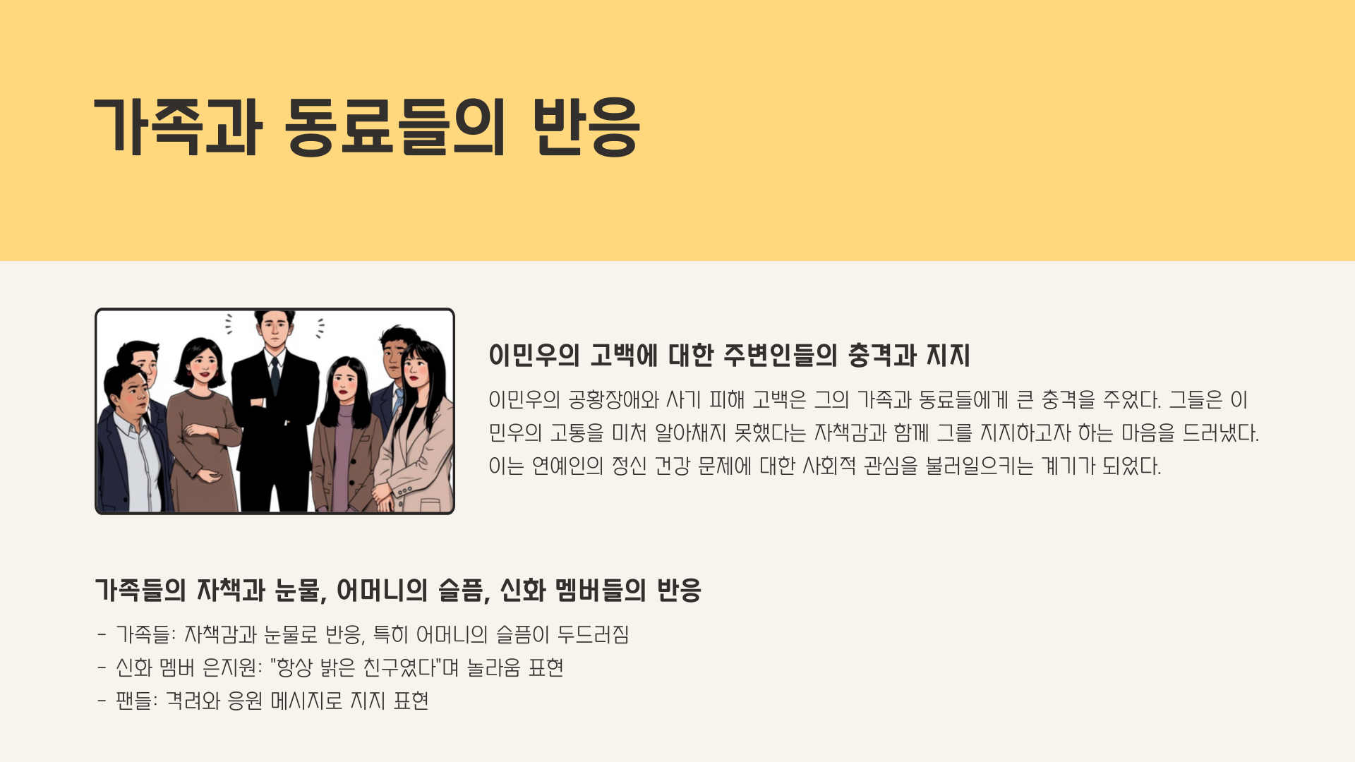 이민우 씨가 아픔을 고백한 후, 가족들은 자책감에 눈물을 보였다고 해요. 특히 어머니는 “아들이 그렇게 힘든 줄 몰랐다”며 방송 중 눈시울을 붉히셨죠. 신화 멤버 은지원 씨도 “이민우는 항상 밝은 친구였다”며, 그 밝음 뒤에 감춰진 고통을 이제서야 이해하게 됐다고 털어놨습니다.