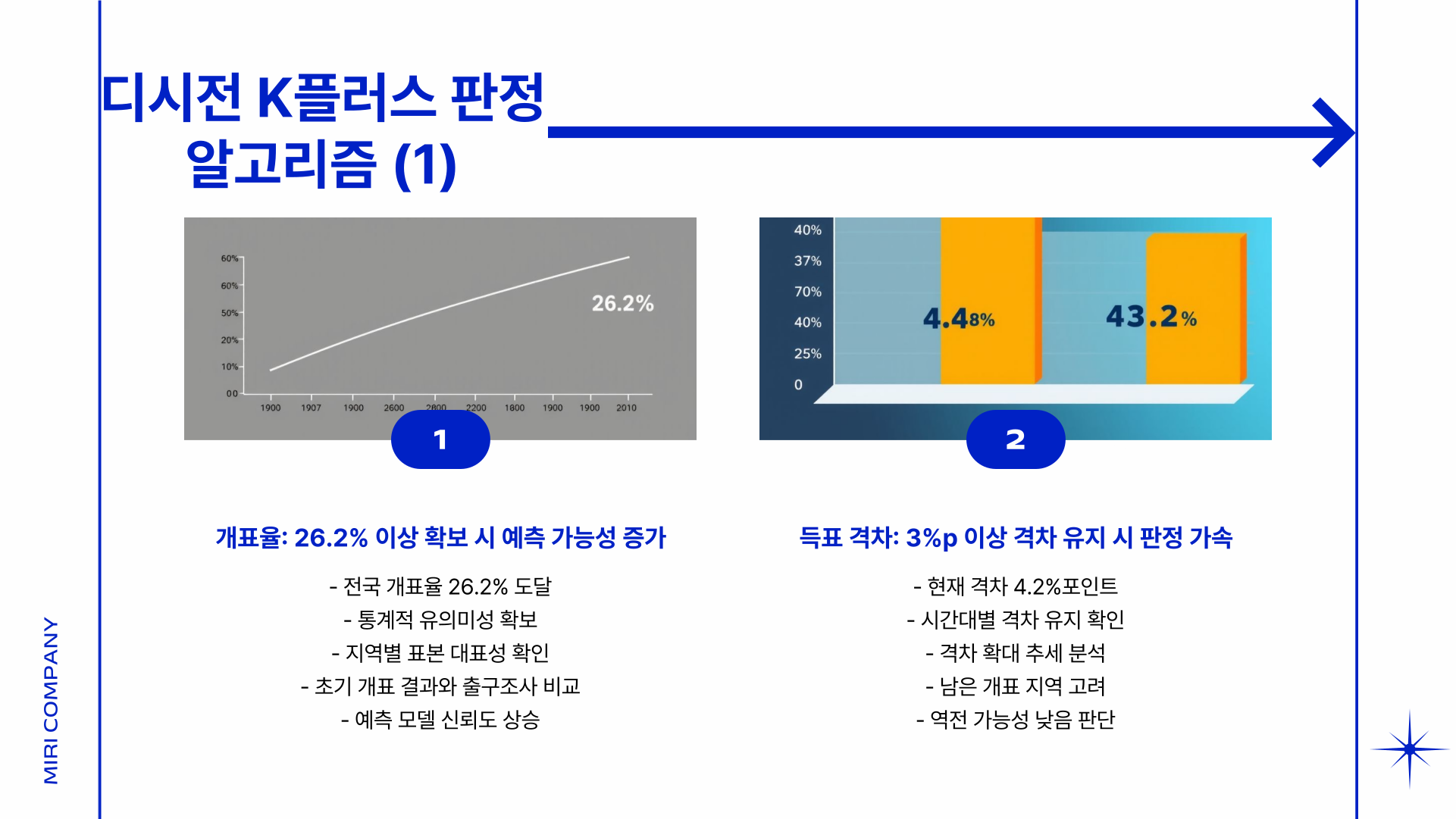 개표율, 득표율 격차, 지역별 유불리, 남은 표 수 등을 기반으로 판단합니다.