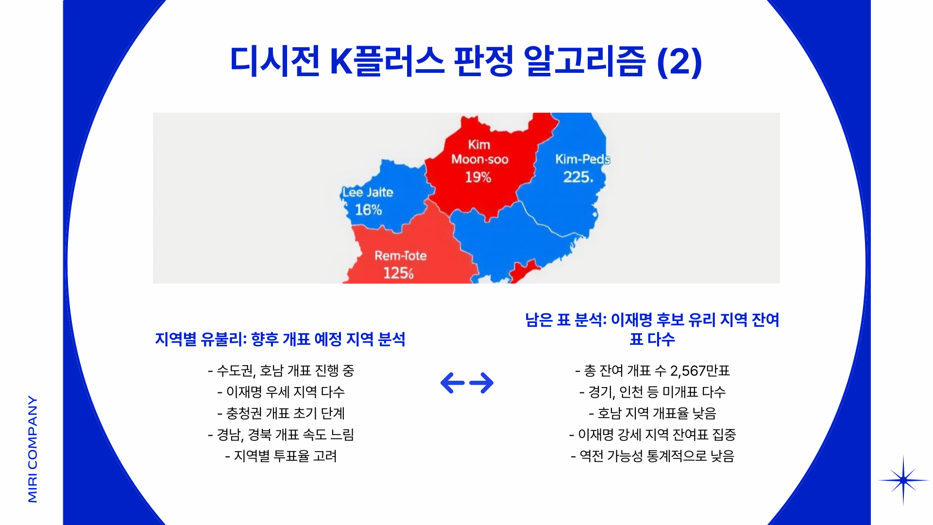득표 격차와 잔여표 분포, 향후 개표 지역의 성향 등을 종합 분석하여 예측합니다.