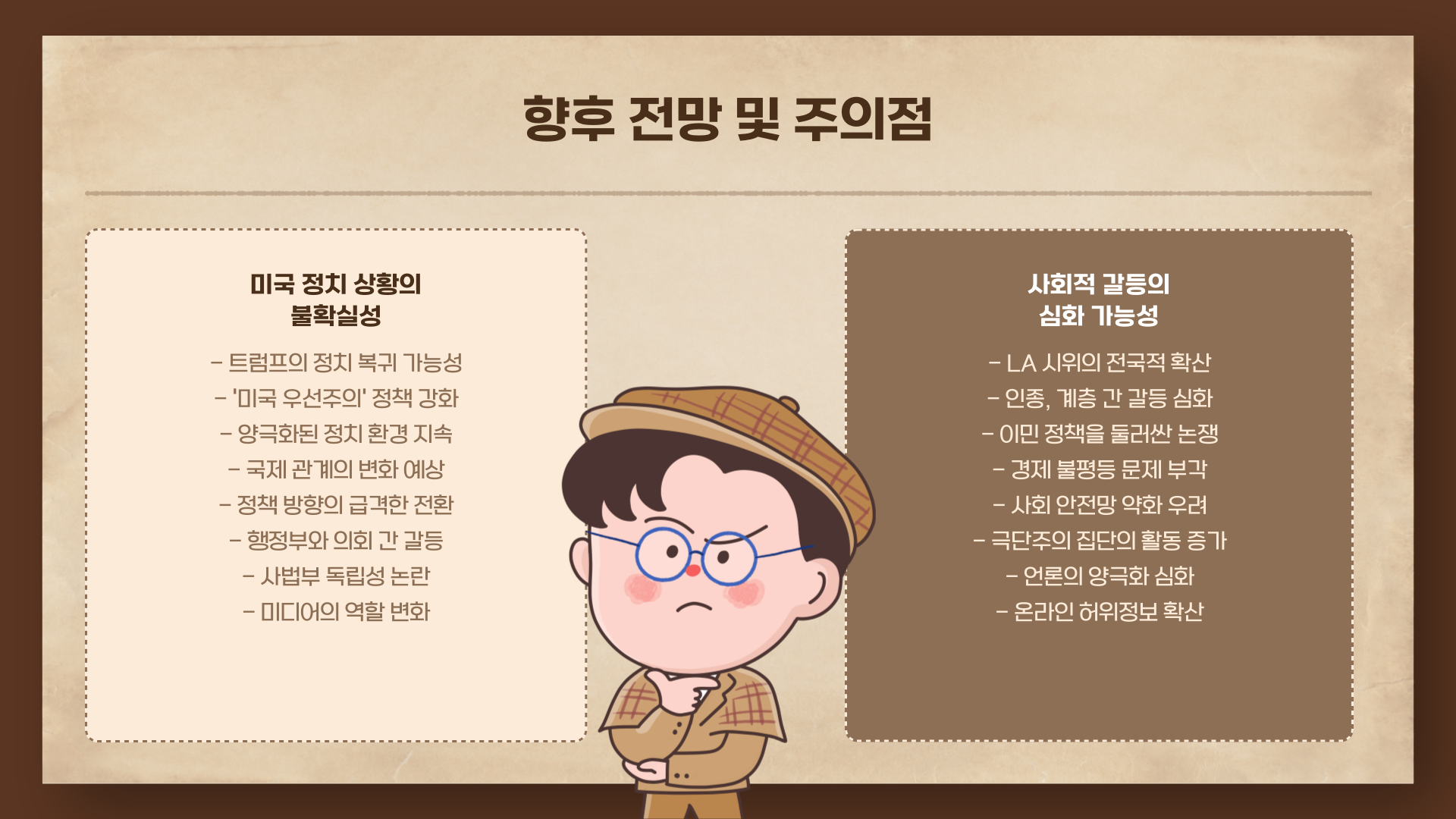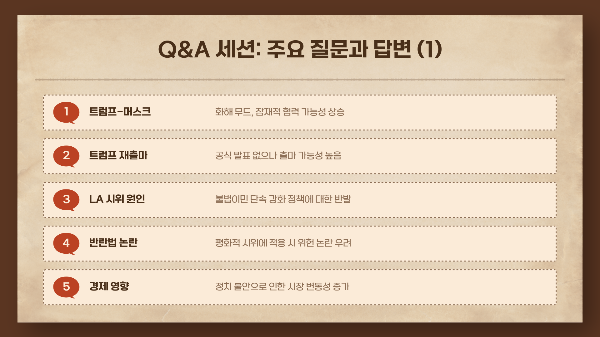 오늘 이야기한 트럼프와 머스크의 관계, 정치 복귀 움직임, LA 시위와 반란법 논란까지... 여러분도 느끼셨겠지만 미국의 정세가 정말 예사롭지 않죠. 이럴 때일수록 우리 모두는 더 넓은 시야로 국제 뉴스를 바라보고, 시장과 사회 변화에 민감하게 대응할 필요가 있어요. 혹시 이 주제에 대해 더 이야기 나누고 싶은 분들 계신가요? 댓글로 의견 남겨주시면 저도 함께 고민하고 더 깊이 있는 이야기를 풀어볼게요. 우리 함께 이런 격동의 시대를 지혜롭게 헤쳐나가 보자구요!