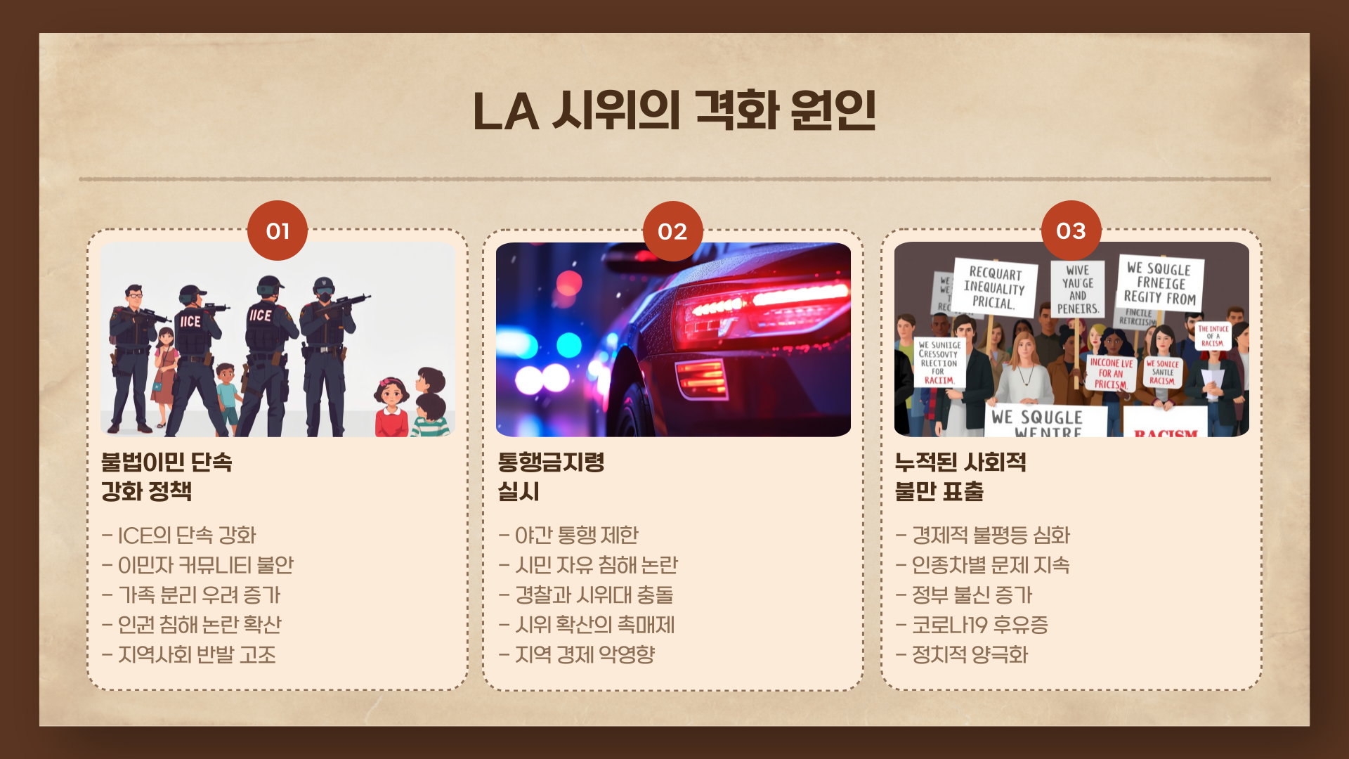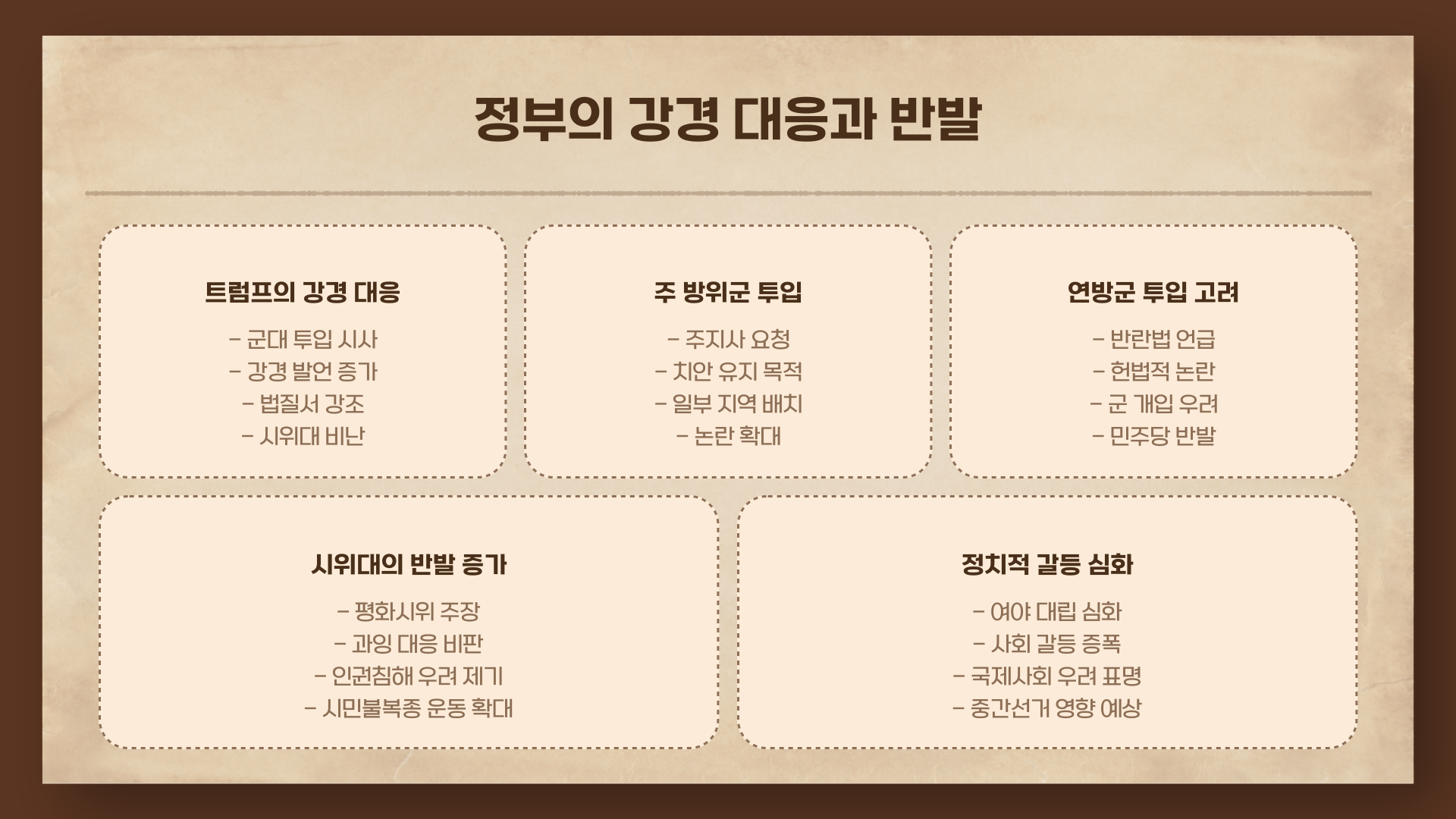 최근 LA를 중심으로 벌어진 시위는 트럼프 행정부의 불법이민자 단속과 관련한 사회적 반발에서 시작됐어요. 이 시위는 뉴욕, 시카고, 워싱턴 D.C.로 확산되었고 일부 지역에선 야간 통행금지령까지 내려진 상황이에요. 트럼프 대통령은 이 사태를 엄중하게 보고 있으며, 주 방위군과 연방 군대의 투입을 고려하고 있다고 강력하게 밝히고 있어요. 이런 대응은 오히려 시위대의 반발을 더욱 키우는 결과를 낳고 있죠.