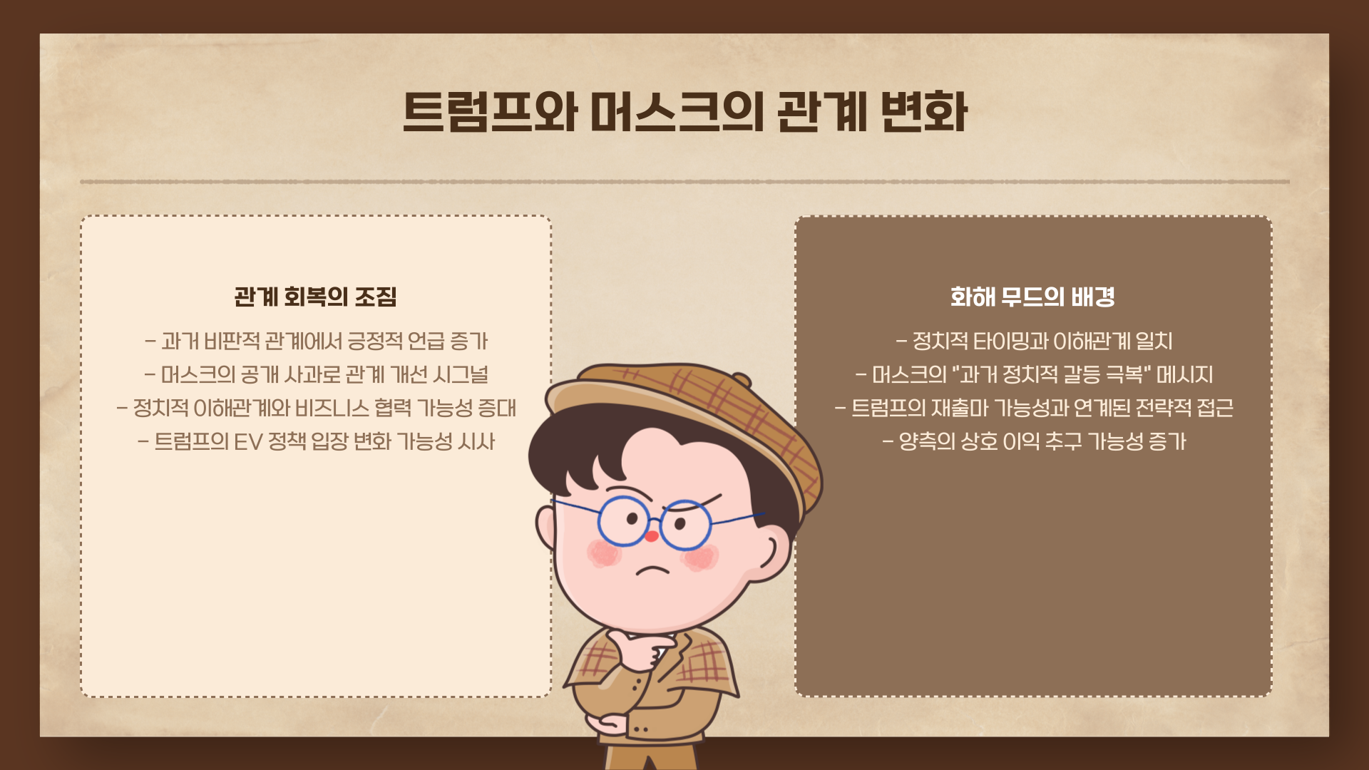 트럼프 전 대통령과 일론 머스크 CEO의 관계가 최근 다시 주목받고 있어요. 한때 서로 비판을 주고받던 사이였지만, 최근 들어 긍정적인 언급과 교류가 늘면서 관계 회복의 조짐이 보인다는 분석이 나오고 있죠. 특히 머스크가 트럼프에게 공개적으로 사과하며 "과거의 정치적 갈등을 넘어서자"는 메시지를 전달한 건 상당히 의미 있는 행보로 해석되고 있어요. 이런 화해 무드는 정치적 이해관계와 비즈니스 협력 가능성이 맞물려서 일어난 변화라는 분석이 지배적이에요.