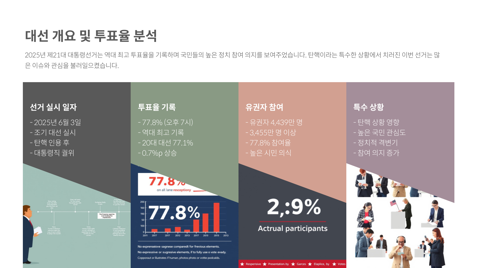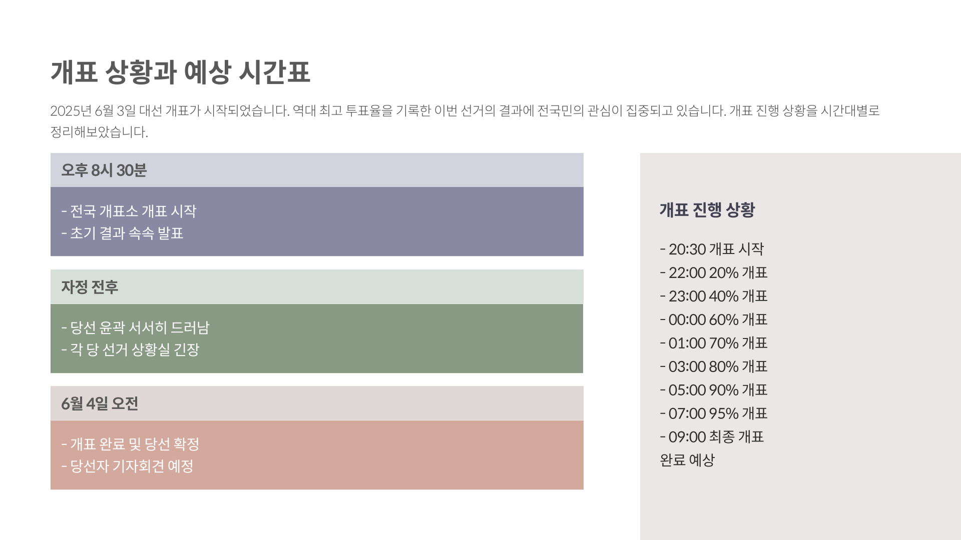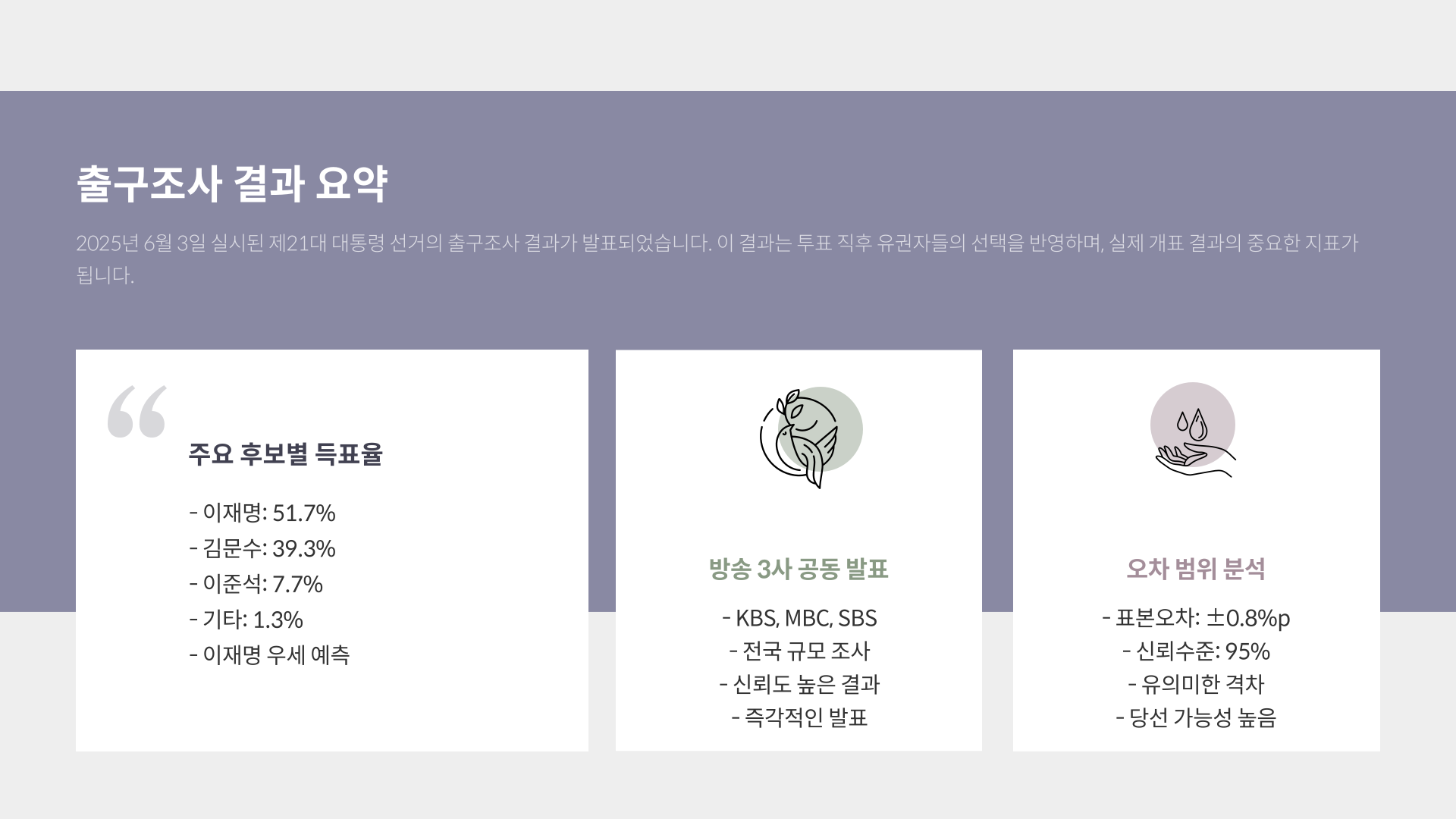 2025년 대선이라는 역사적 하루를 함께 따라가보셨는데요, 여러분의 마음엔 어떤 감정이 남았나요? 높은 투표율 속에 드러난 국민의 열망, 예측을 뛰어넘는 출구조사 결과, 그리고 밤새도록 진행될 개표까지… 오늘 하루는 정말 잊지 못할 것 같아요. 정치가 멀리 있는 이야기가 아니라 우리 삶 속 깊숙이 들어와 있다는 걸, 이번 선거가 분명히 보여줬습니다. 여러분의 한 표가 만들어갈 내일을 기대하며, 다음 이야기에서 다시 만나요. 💜