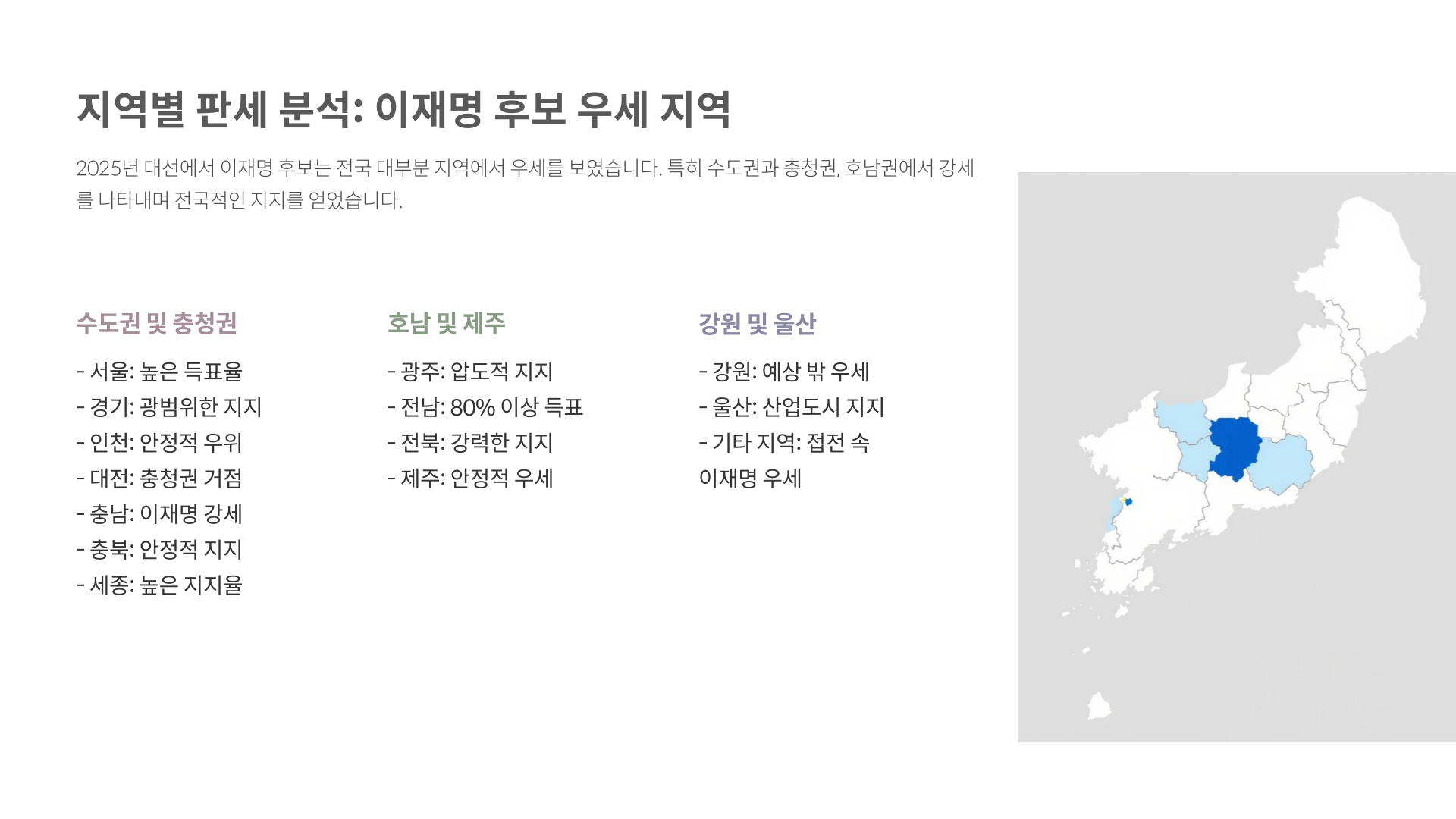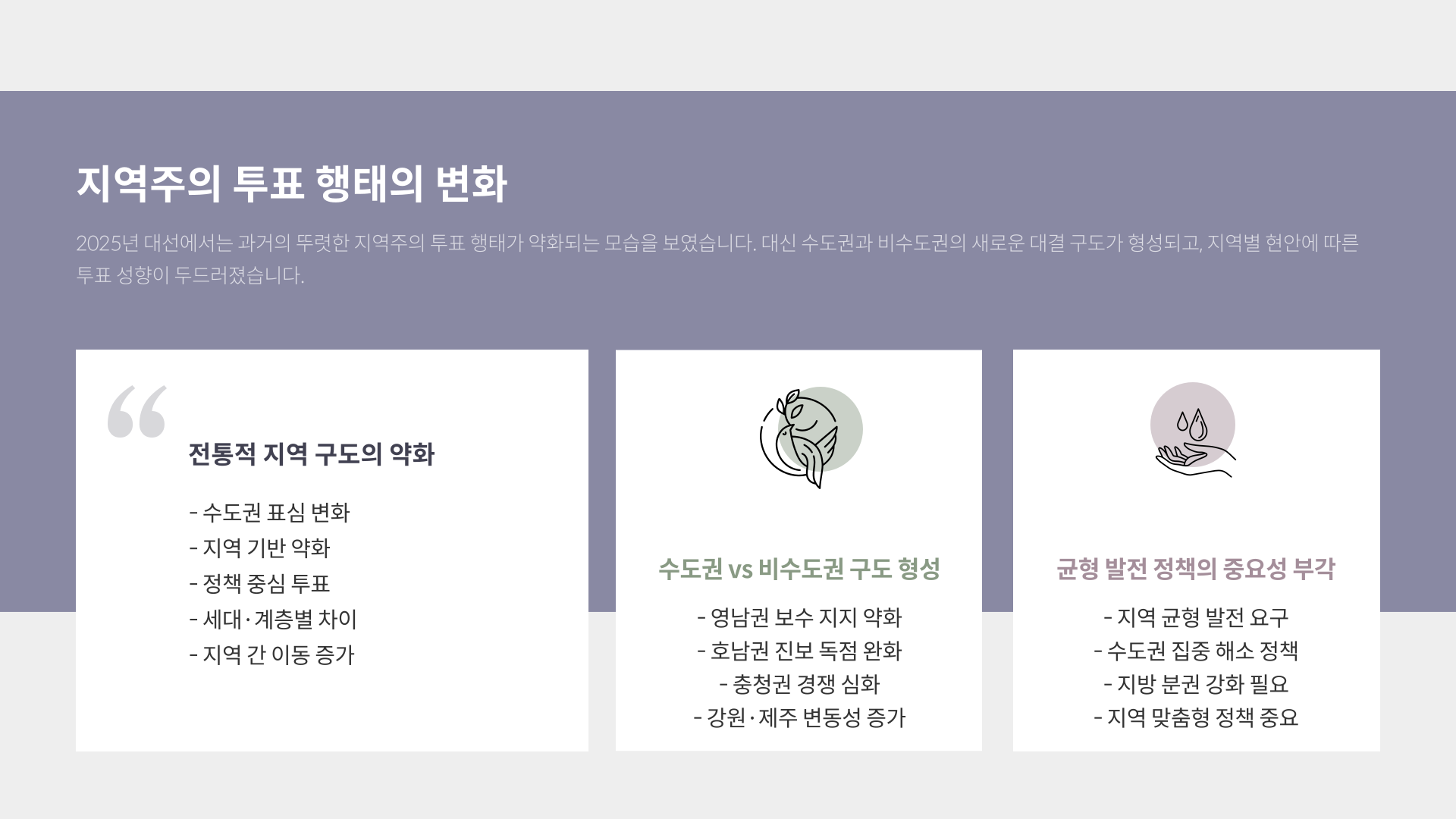 출구조사 결과를 바탕으로 각 후보의 지역별 우세를 살펴보면, 이재명 후보는 수도권을 포함한 대부분의 지역에서 우위를 보였어요. 특히 서울, 경기, 인천 등 수도권과 함께 울산, 광주, 전남, 전북, 대전, 충남, 충북, 세종, 강원, 제주에서 강세를 나타냈습니다. 반면 김문수 후보는 대구, 경북, 부산, 경남에서 전통적 지지세를 기반으로 우세를 점했죠. 지역별 정치 성향이 확연히 드러나는 대목입니다.