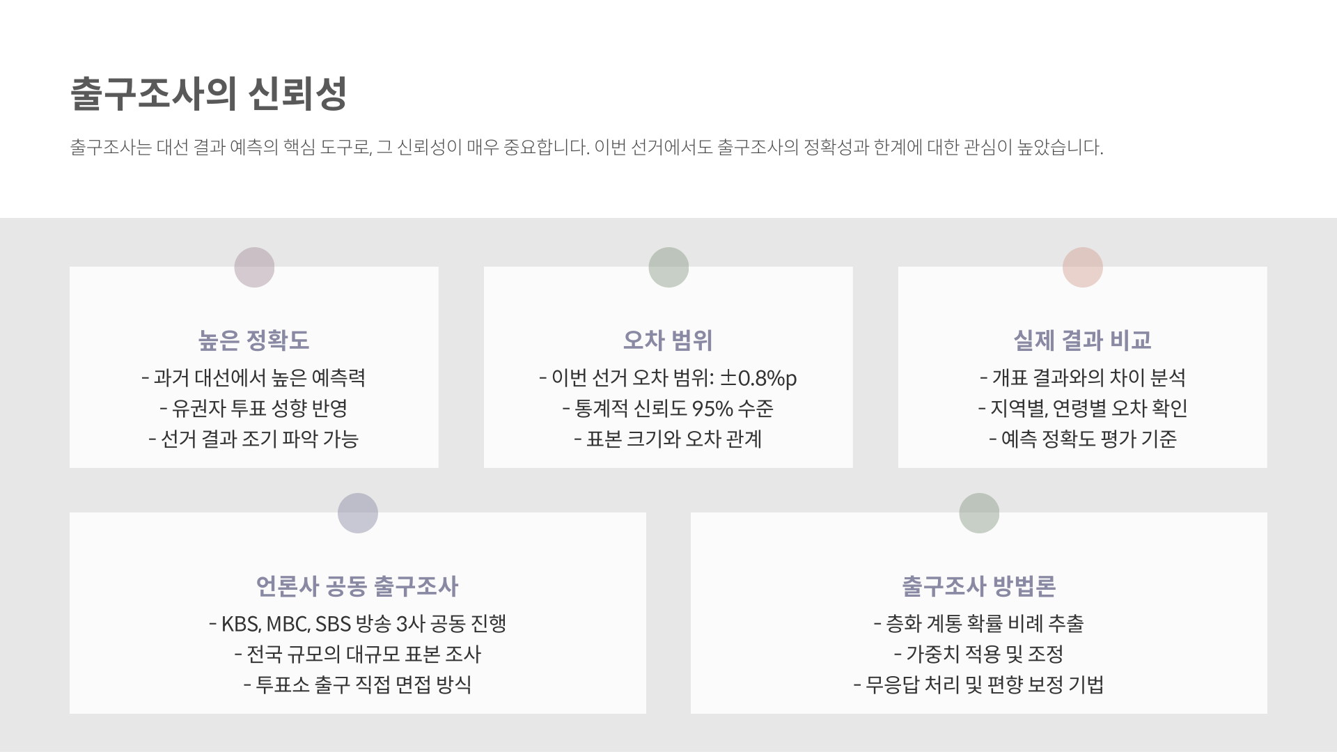 역대 대선에서 거의 정확한 예측을 보여왔으며, 이번에도 ±0.8%p 오차 범위를 가졌습니다.