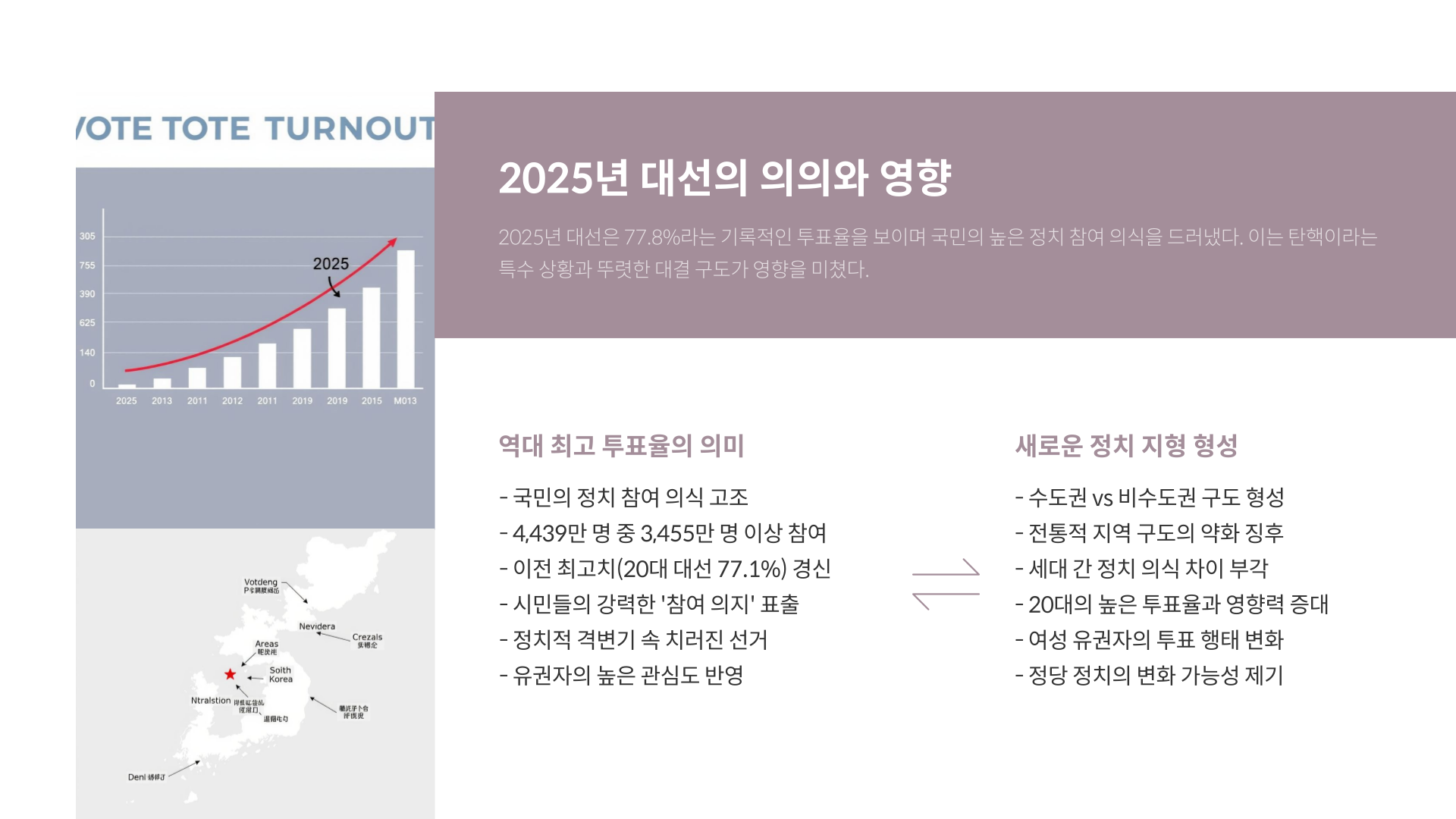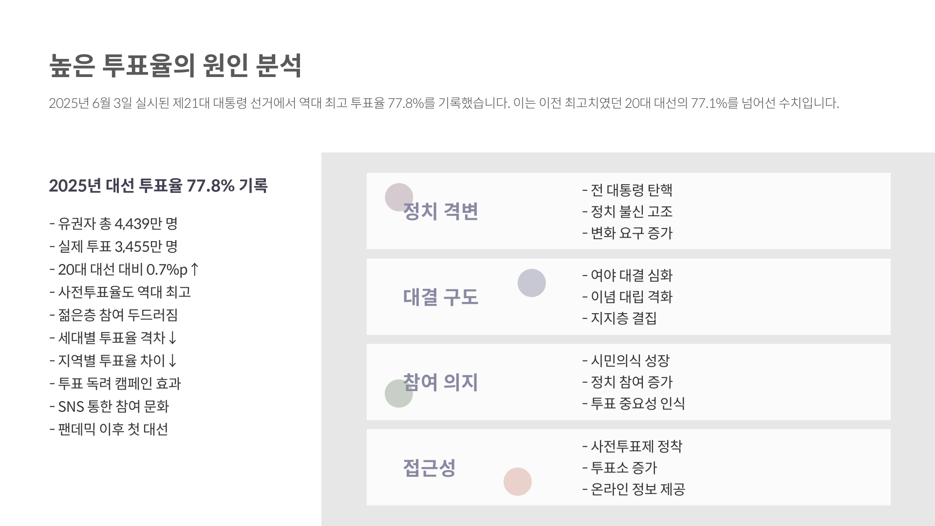 정치적 격변기였던 탄핵 상황과 후보 간 뚜렷한 대결 구도가 유권자의 참여를 자극한 결과입니다.
