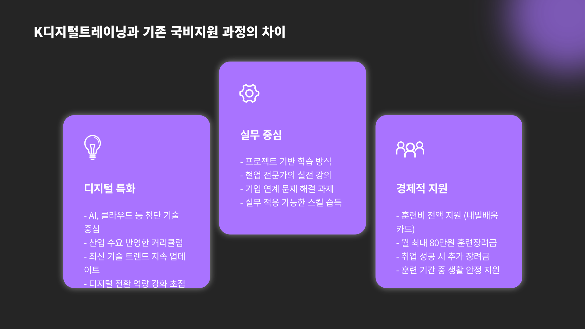 K디지털트레이닝은 고용노동부가 운영하는 국비지원 직업훈련 프로그램이에요.