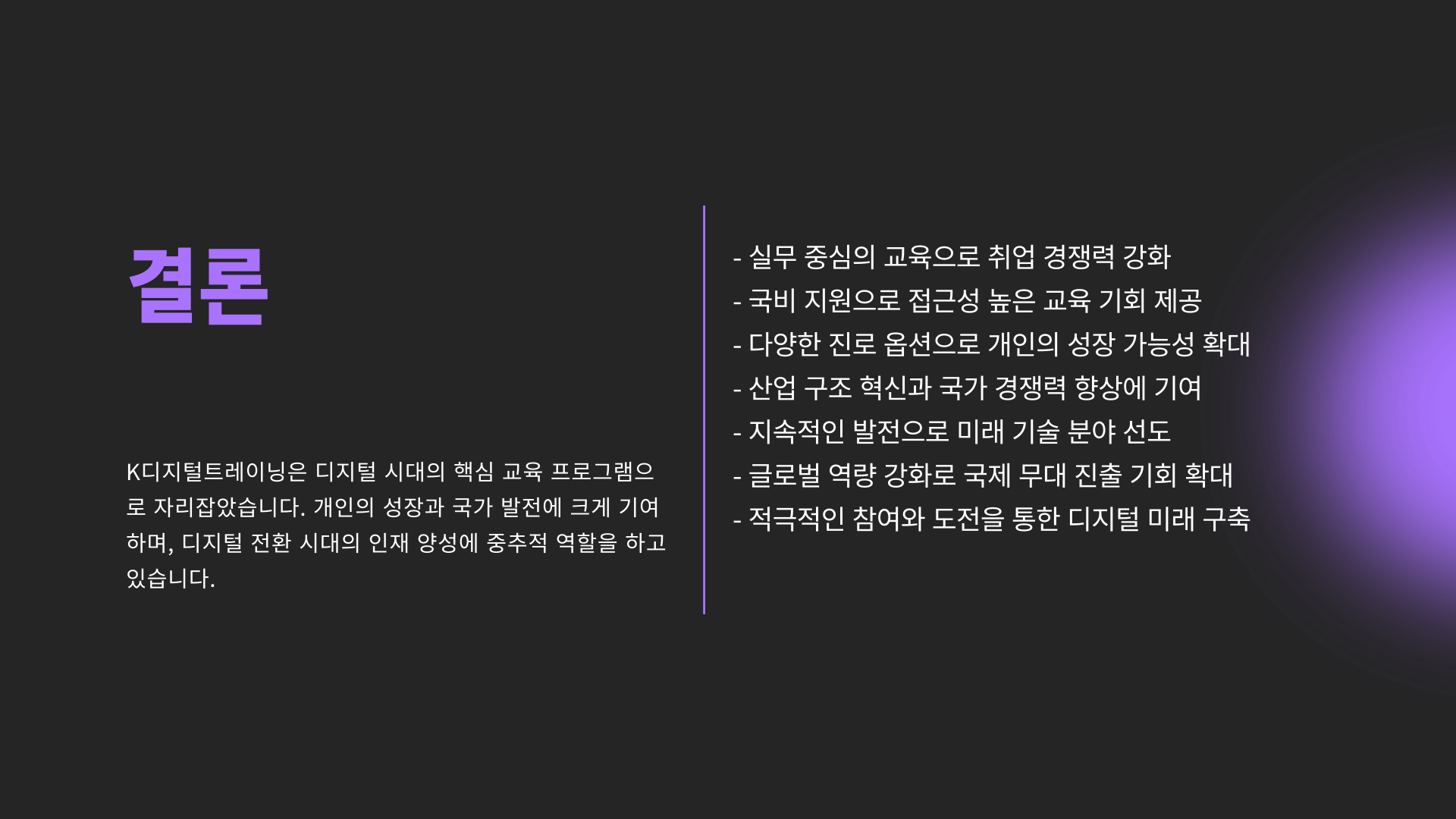 K디지털트레이닝은 프로그램은 디지털 시대에 새로운 기회를 잡고자 하는 분들에게 강력한 도구가 되어줍니다.