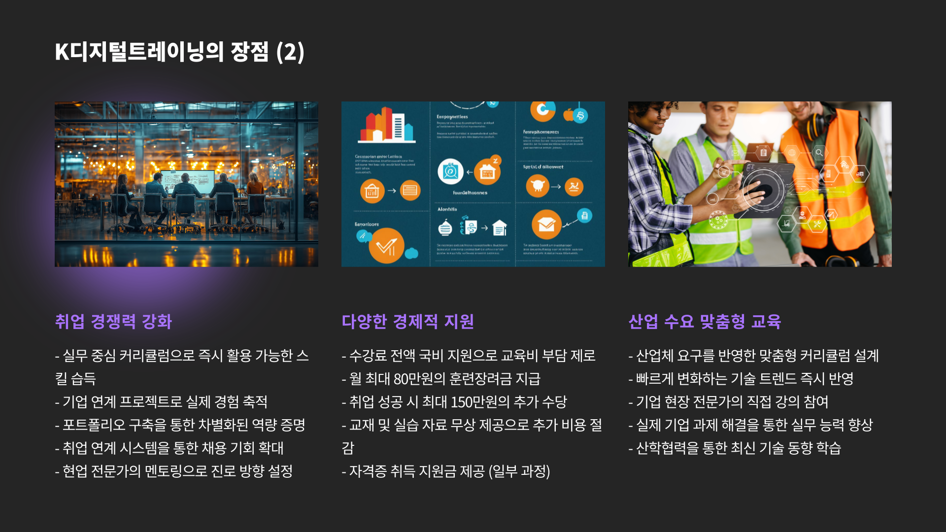 국비지원으로 교육비 부담 없이 배울 수 있고, 실무 중심 커리큘럼과 다양한 취업 연계로 디지털 커리어를 현실로 만들 수 있어요.