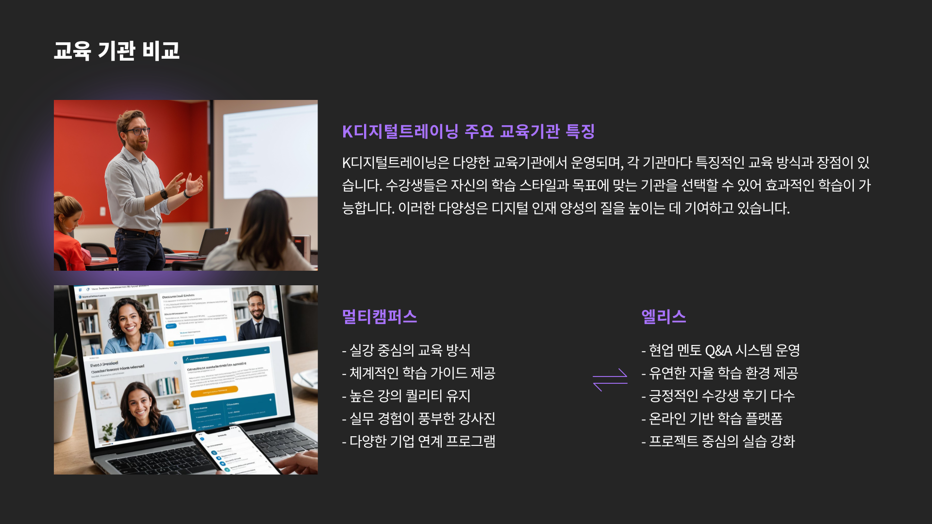 K디지털트레이닝은 다양한 교육기관에서 운영되는데, 기관마다 커리큘럼과 운영 방식이 달라요.