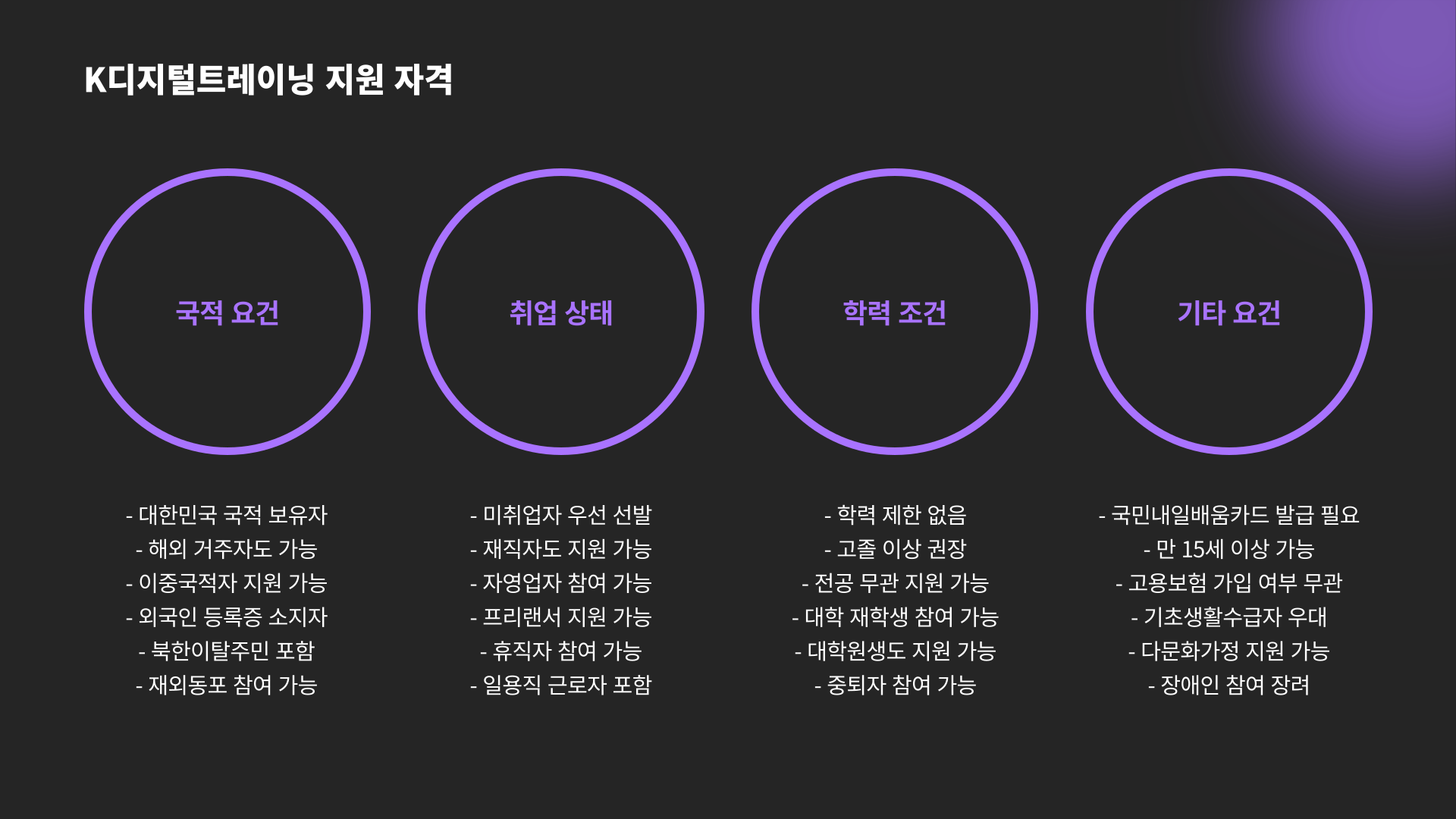 대한민국 국적의 미취업자라면 누구나 신청 가능하며, 국민내일배움카드 발급이 필요합니다.